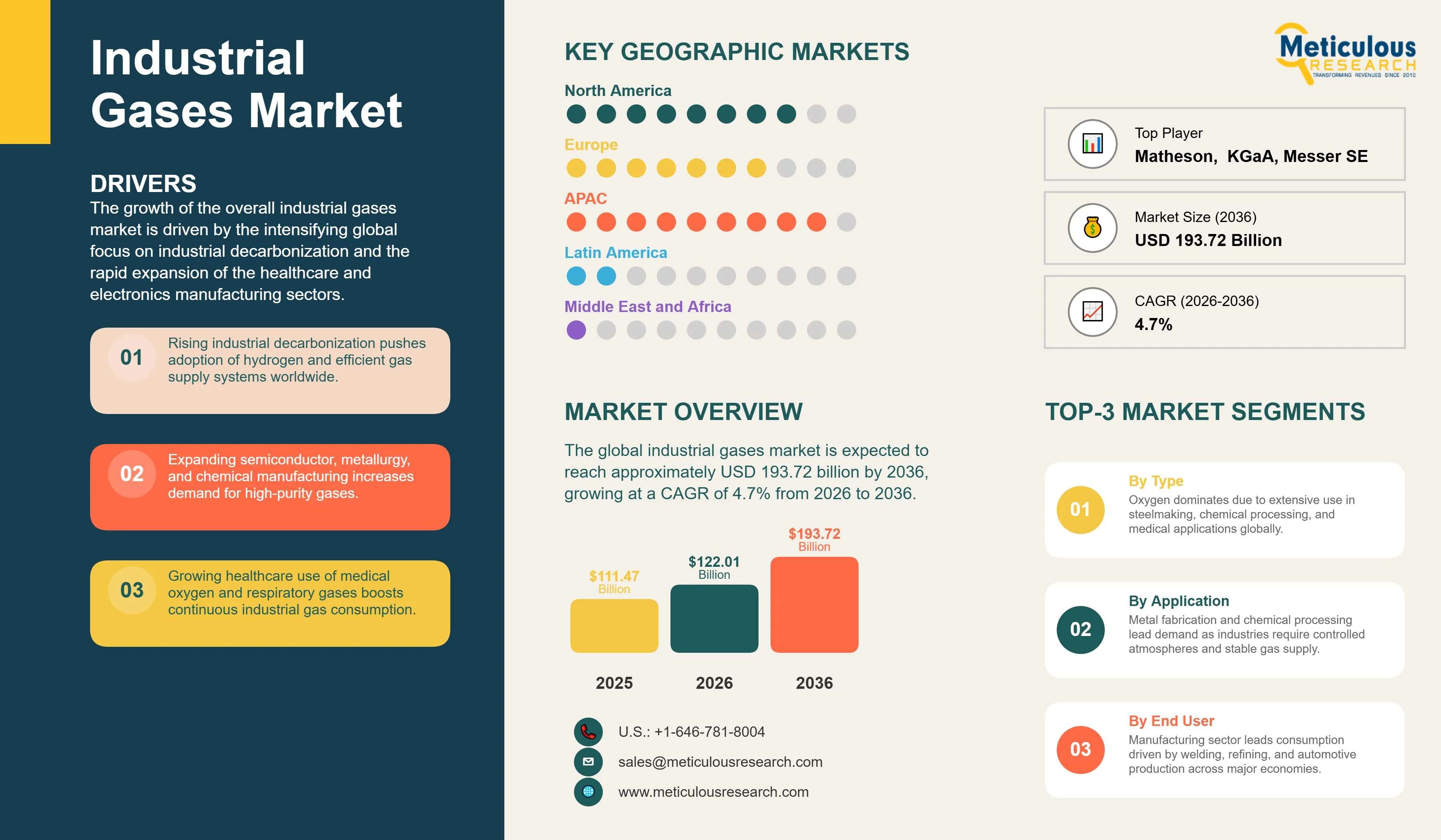Industrial Gases Market by Type (Oxygen, Nitrogen, Hydrogen, Carbon Dioxide, Argon, Acetylene, Helium), Supply Mode (On-site, Bulk/Liquid, Cylinder/Merchant), End-use Industry (Manufacturing, Metallurgy, Healthcare, Chemicals & Petrochemicals), and Geography – Global Forecast to 2036