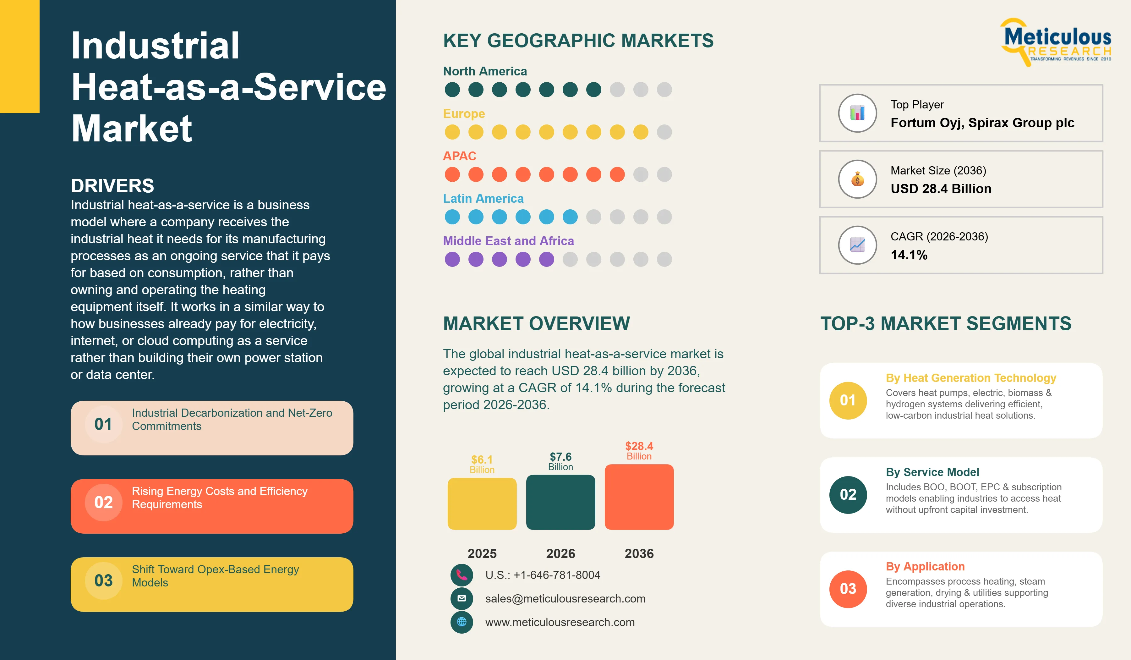 Report ID: MROTH - 1041933 Pages: 282 Apr-2026 Formats*: PDF Category: Others Delivery: 24 to 72 Hours Download Free Sample ReportThe global industrial heat-as-a-service market was valued at USD 6.1 billion in 2025. This market is expected to reach USD 28.4 billion by 2036 from an estimated USD 7.6 billion in 2026, growing at a CAGR of 14.1% during the forecast period 2026-2036.