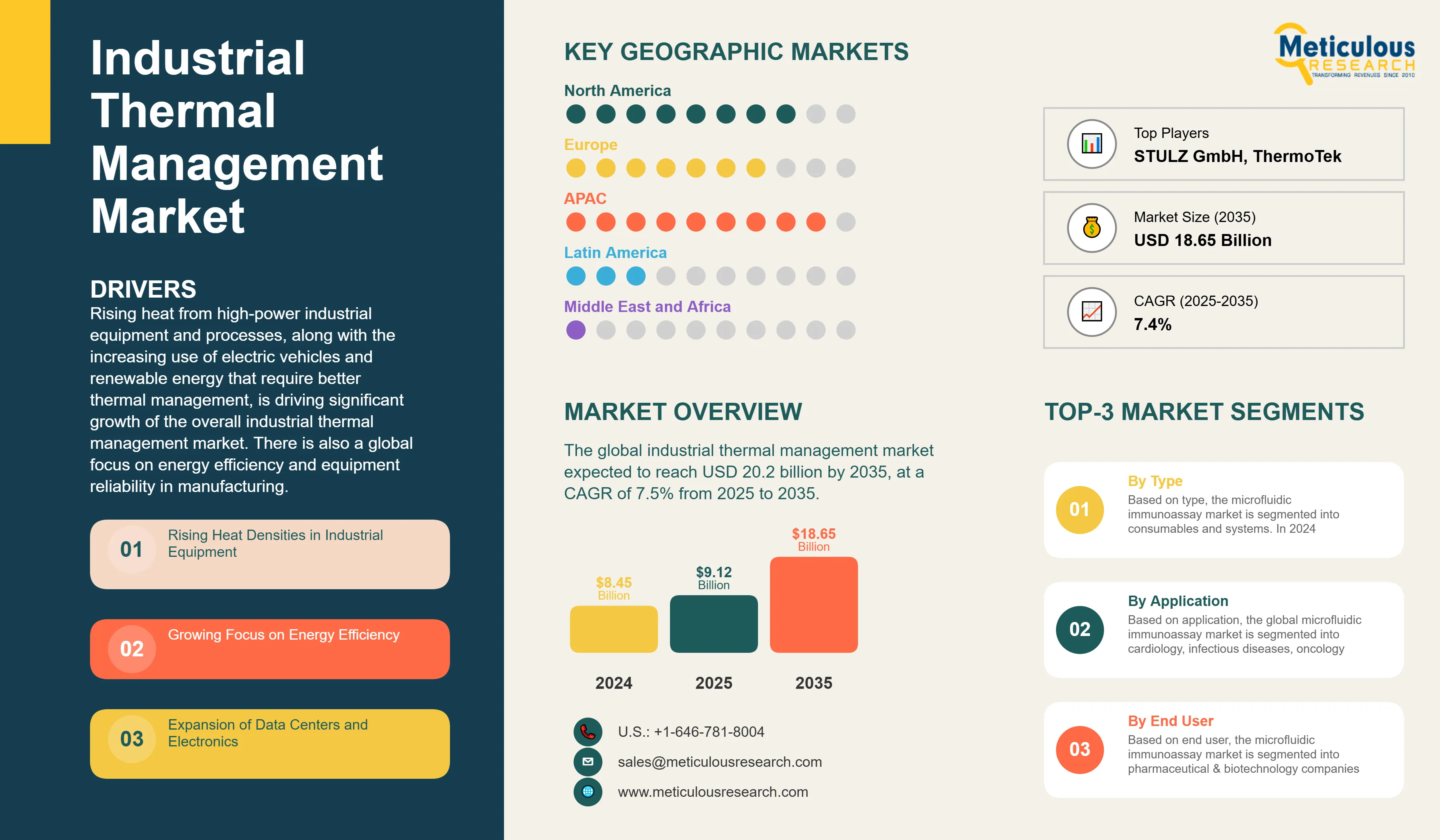 Rising heat from high-power industrial equipment and processes, along with the increasing use of electric vehicles and renewable energy that require better thermal management, is driving significant growth of the overall industrial thermal management market. There is also a global focus on energy efficiency and equipment reliability in manufacturing.