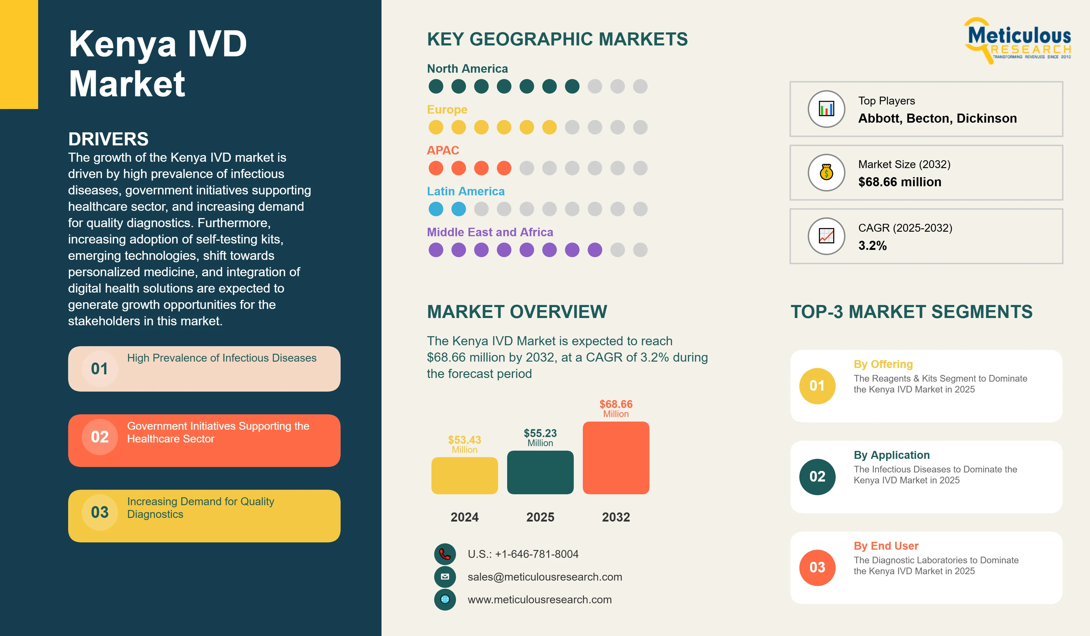The Kenya IVD Market analysis indicates a significant growth to reach $68.66 million by 2032, at a compound annual growth rate (CAGR) of 3.2% from 2025 to 2032.