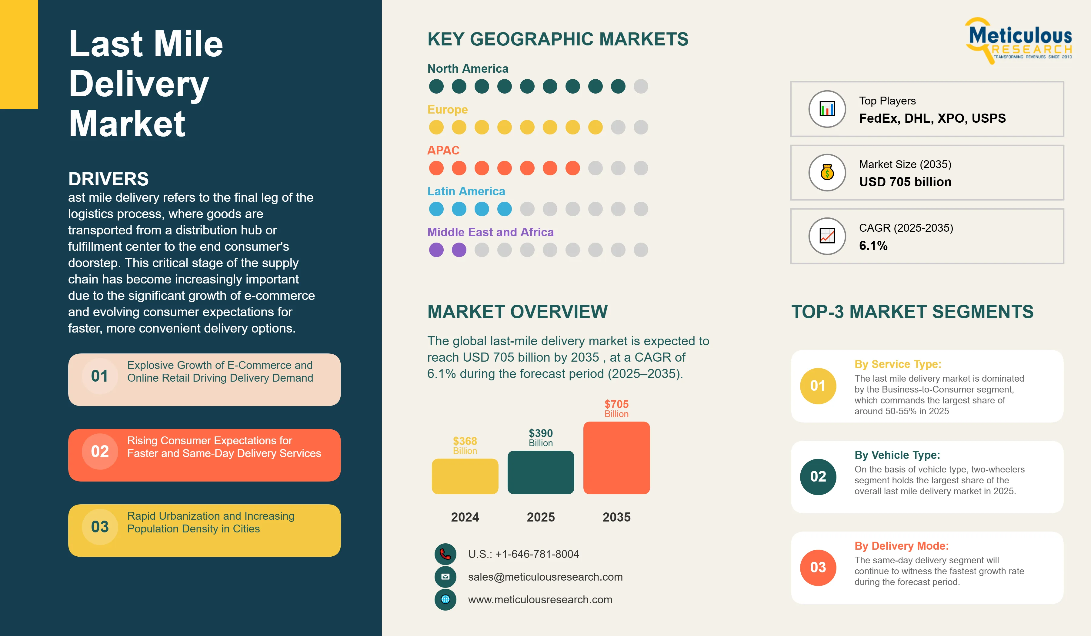 Report ID: MRICT - 1041629 Pages: 245 Dec-2025 Formats*: PDF Category: Information and Communications Technology Delivery: 24 to 72 Hours Download Free Sample ReportThe global last-mile delivery market is expected to reach USD 705 billion by 2035 from USD 390 billion in 2025, at a CAGR of 6.1% during the forecast period (2025–2035). Last mile delivery refers to the final leg of the logistics process, where goods are transported from a distribution hub or fulfillment center to the end consumer's doorstep. This critical stage of the supply chain has become increasingly important due to the significant growth of e-commerce and evolving consumer expectations for faster, more convenient delivery options.