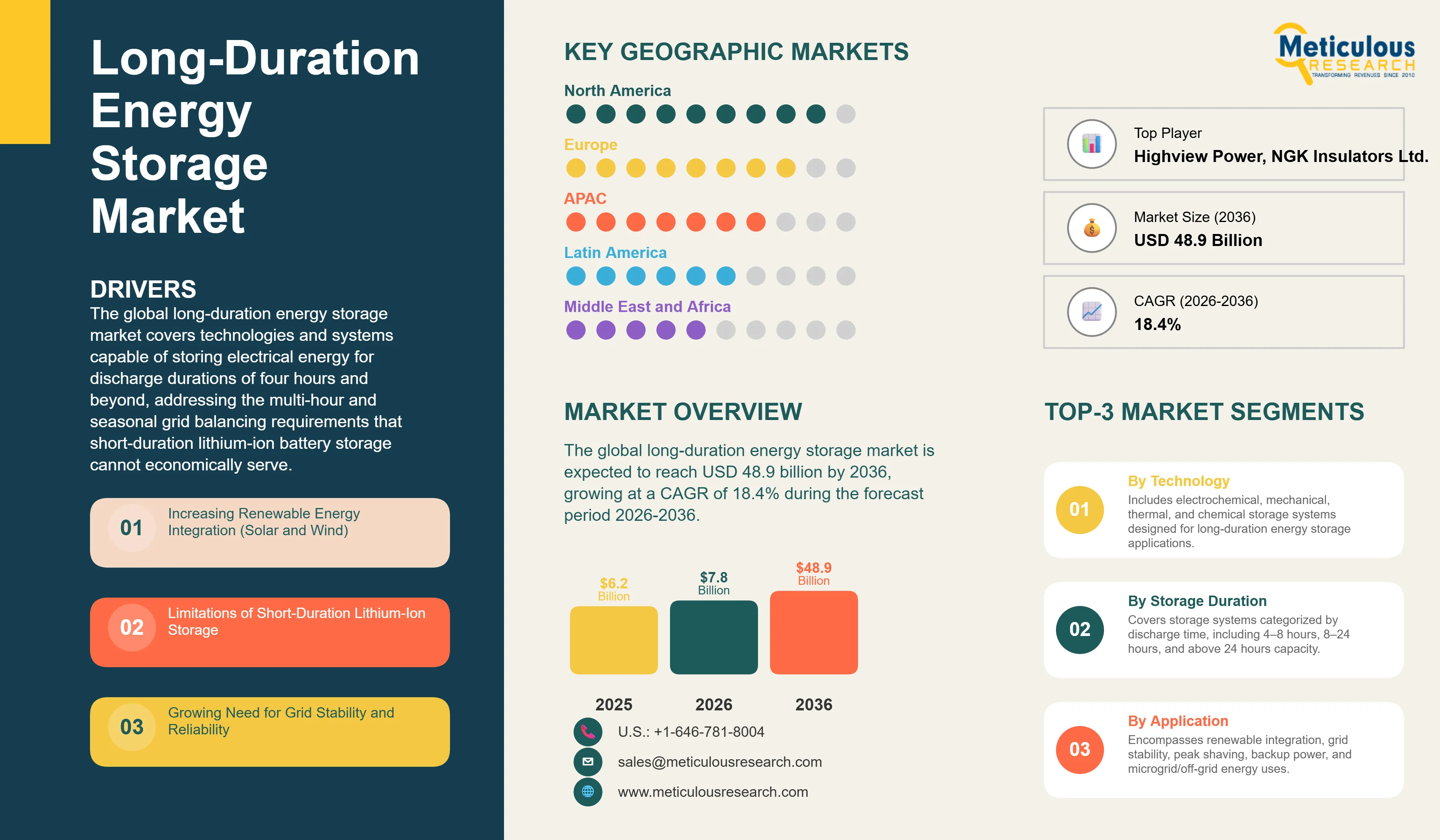 The global long-duration energy storage market is expected to reach USD 48.9 billion by 2036 from an estimated USD 7.8 billion in 2026, at a CAGR of 18.4% during the forecast period 2026-2036.