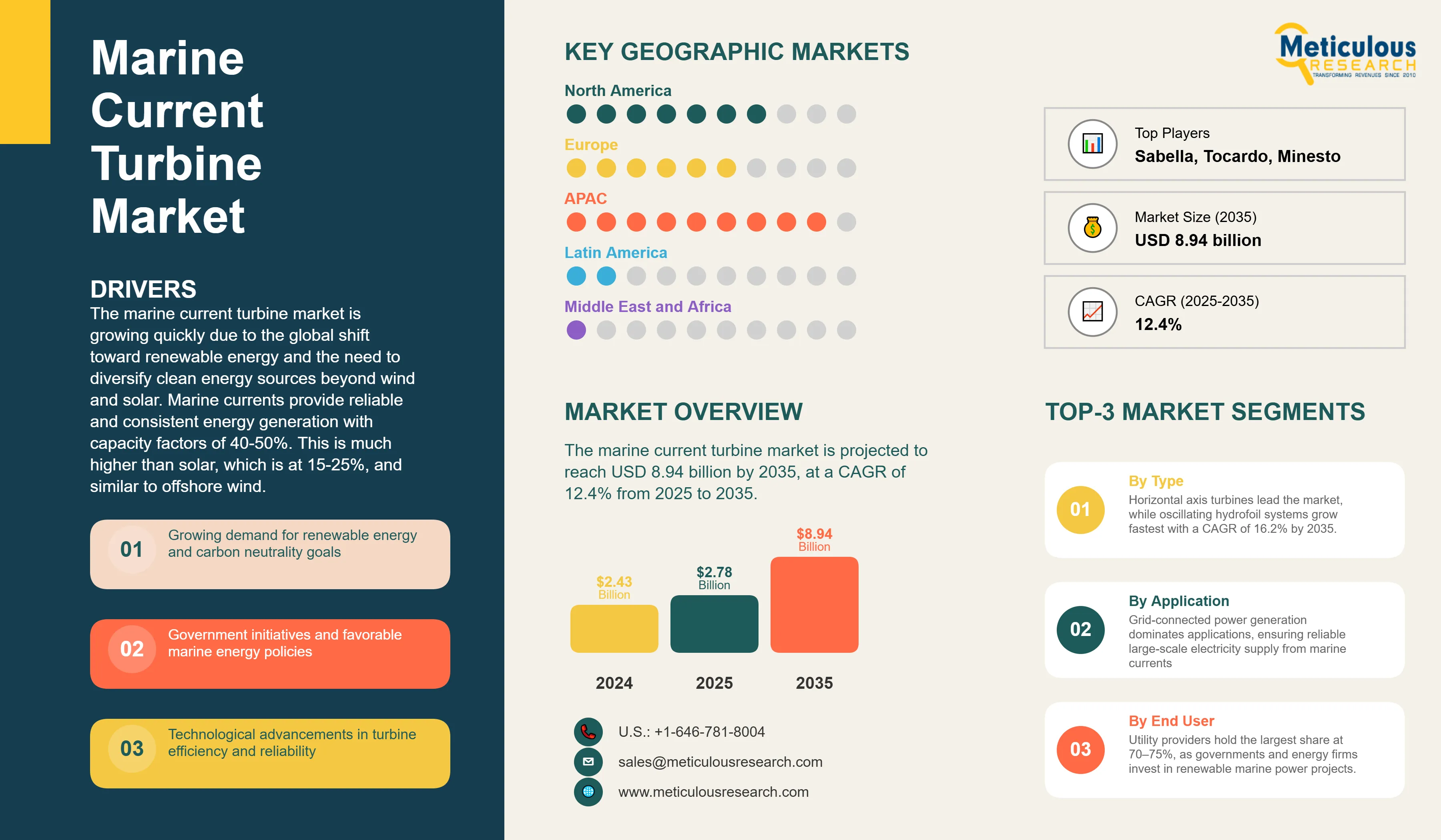 Verdant Power and Ocean Renewable Power Company lead North American market development through Roosevelt Island and Maine tidal projects respectively. European companies including Sabella, Tocardo, and Minesto continue technology innovation through oscillating hydrofoil and vertical axis designs targeting niche applications and specific site conditions.