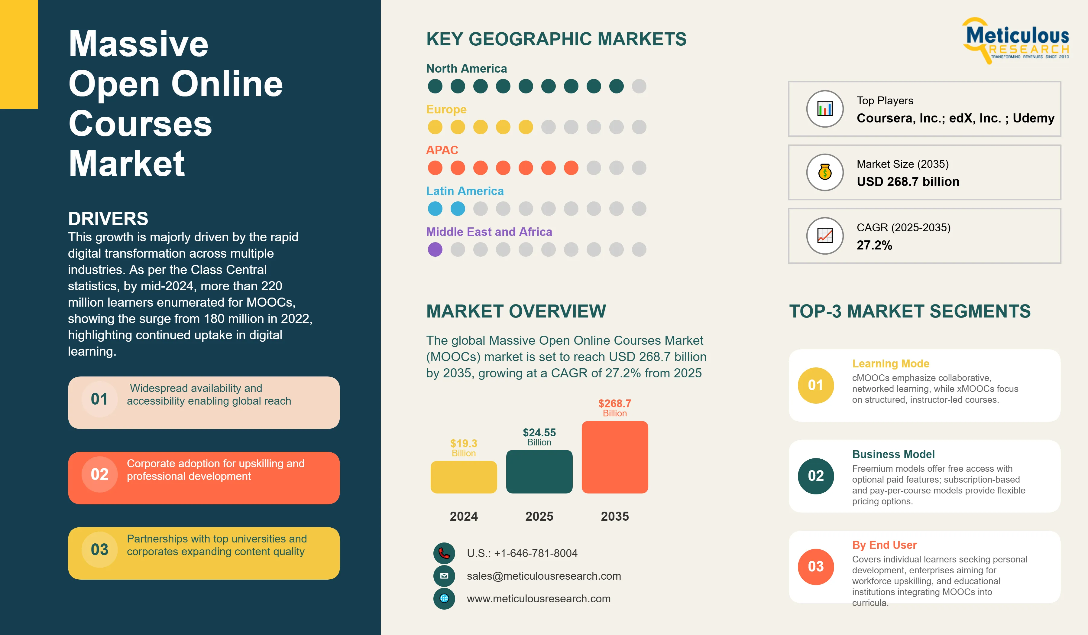 The Massive Open Online Courses Market is estimated to be USD 24.2 billion in 2025 and grow at a CAGR of 27.2% to reach USD 268.7 billion by 2035.