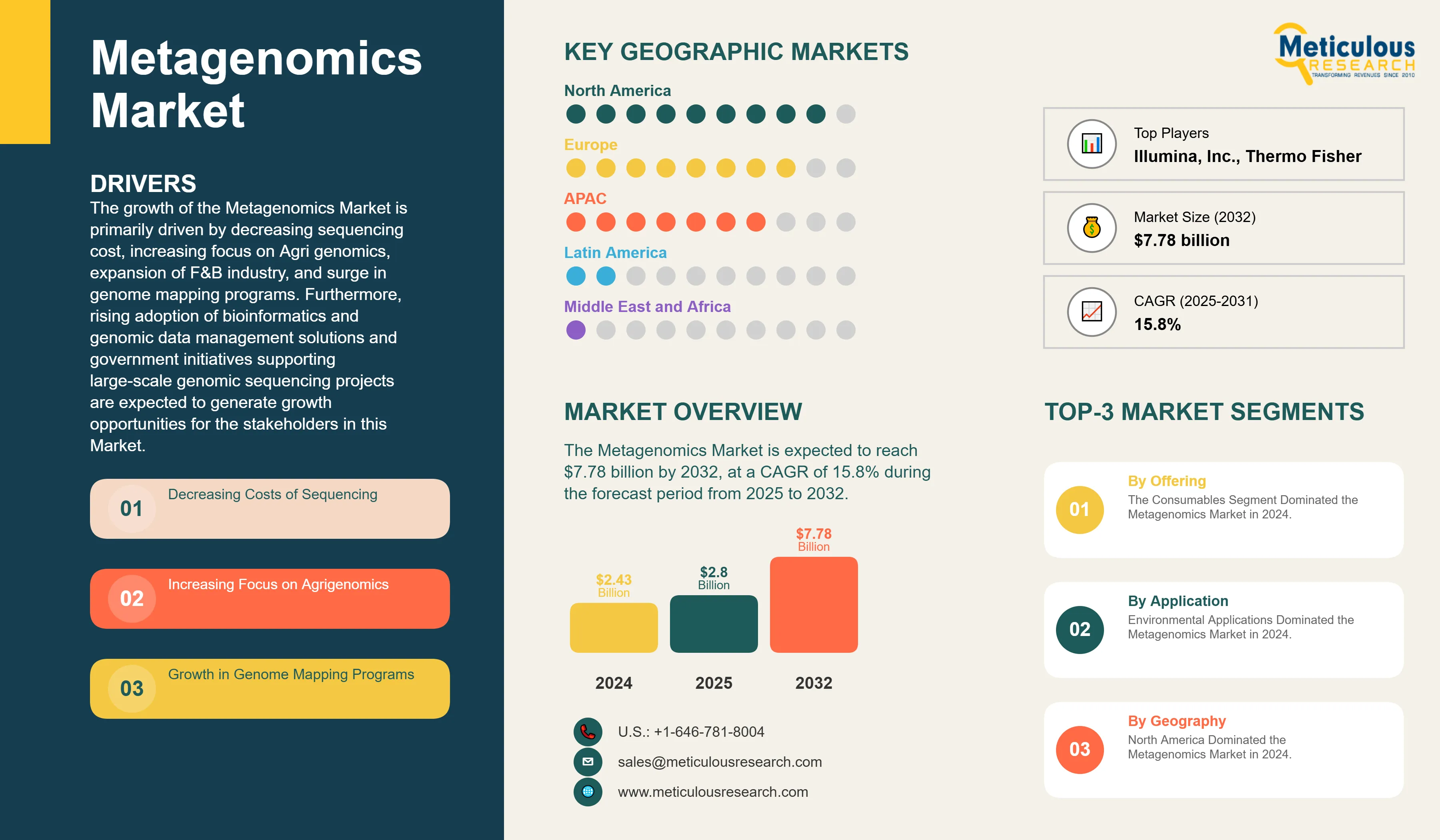 The Metagenomics Market was valued at $2.43 billion in 2024. This market is expected to reach $7.78 billion by 2032 from an estimated $2.80 billion in 2025, at a CAGR of 15.8% during the forecast period from 2025 to 2032.