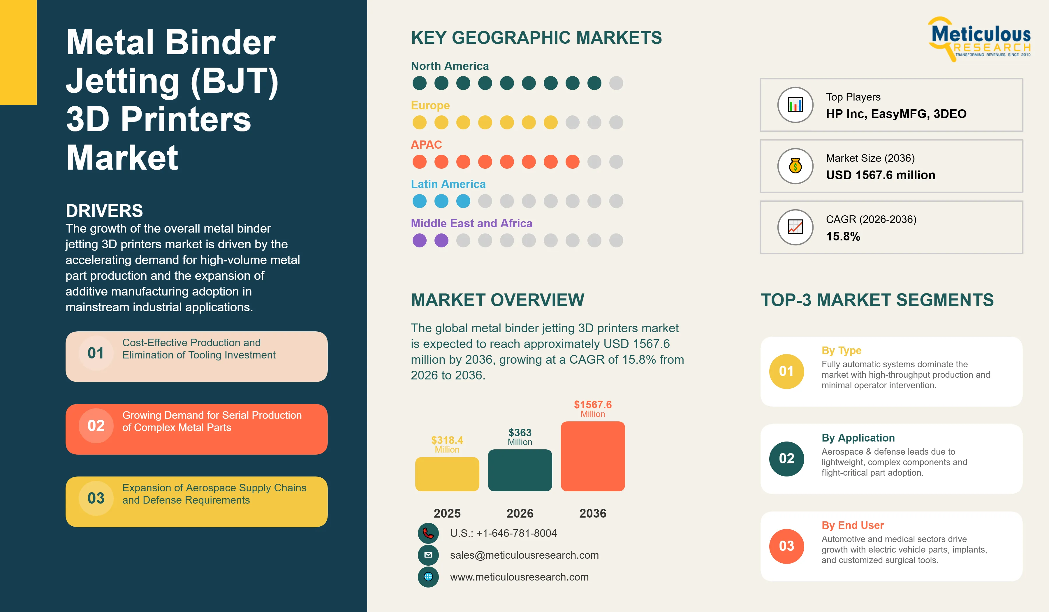 The global metal binder jetting 3D printers market was valued at USD 318.4 million in 2025. The market is expected to reach approximately USD 1567.6 million by 2036 from USD 363.0 million in 2026, growing at a CAGR of 15.8% from 2026 to 2036.