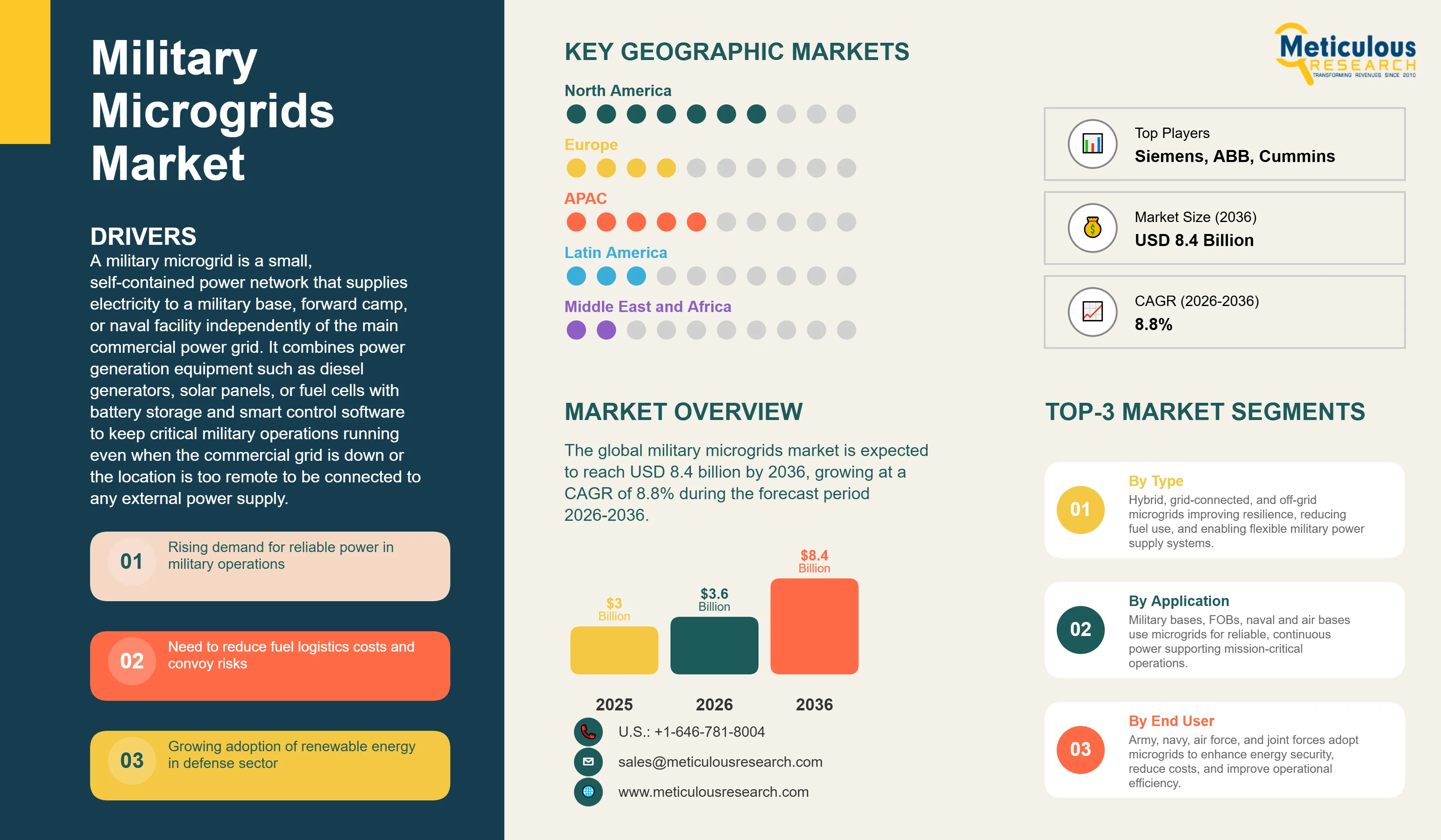 Report ID: MRAD - 1041910 Pages: 282 Apr-2026 Formats*: PDF Category: Aerospace and Defense Delivery: 24 to 72 Hours Download Free Sample ReportThe global military microgrids market was valued at USD 3.0 billion in 2025. This market is expected to reach USD 8.4 billion by 2036 from an estimated USD 3.6 billion in 2026, growing at a CAGR of 8.8% during the forecast period 2026-2036.
