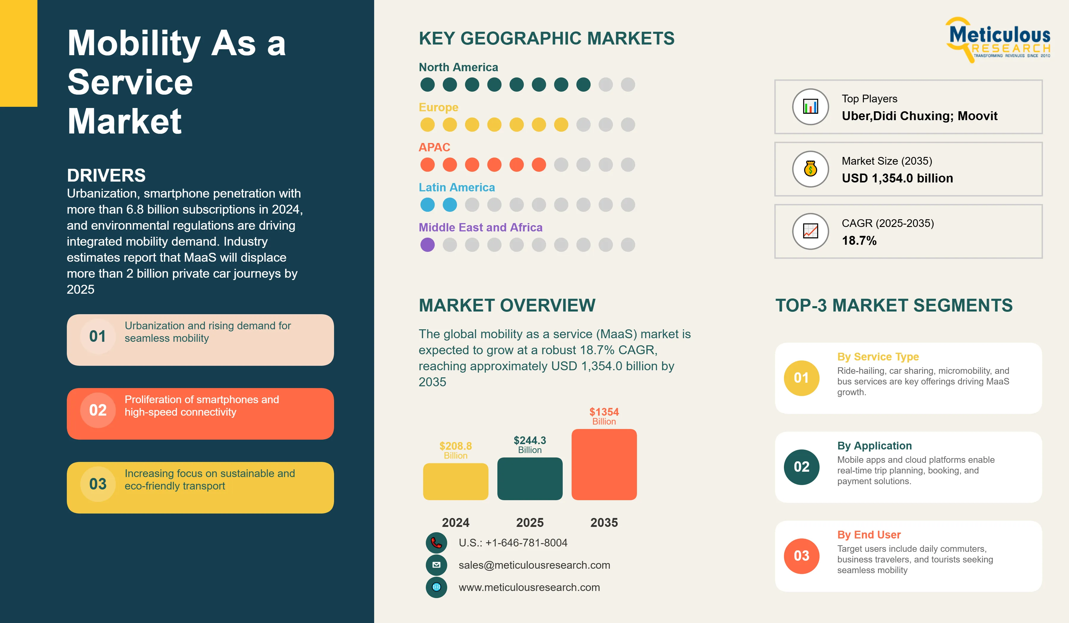 The mobility as a service market size is estimated to be USD 244.3 billion in 2025 and grow at a CAGR of 18.7% to reach USD 1,354 billion by 2035.
