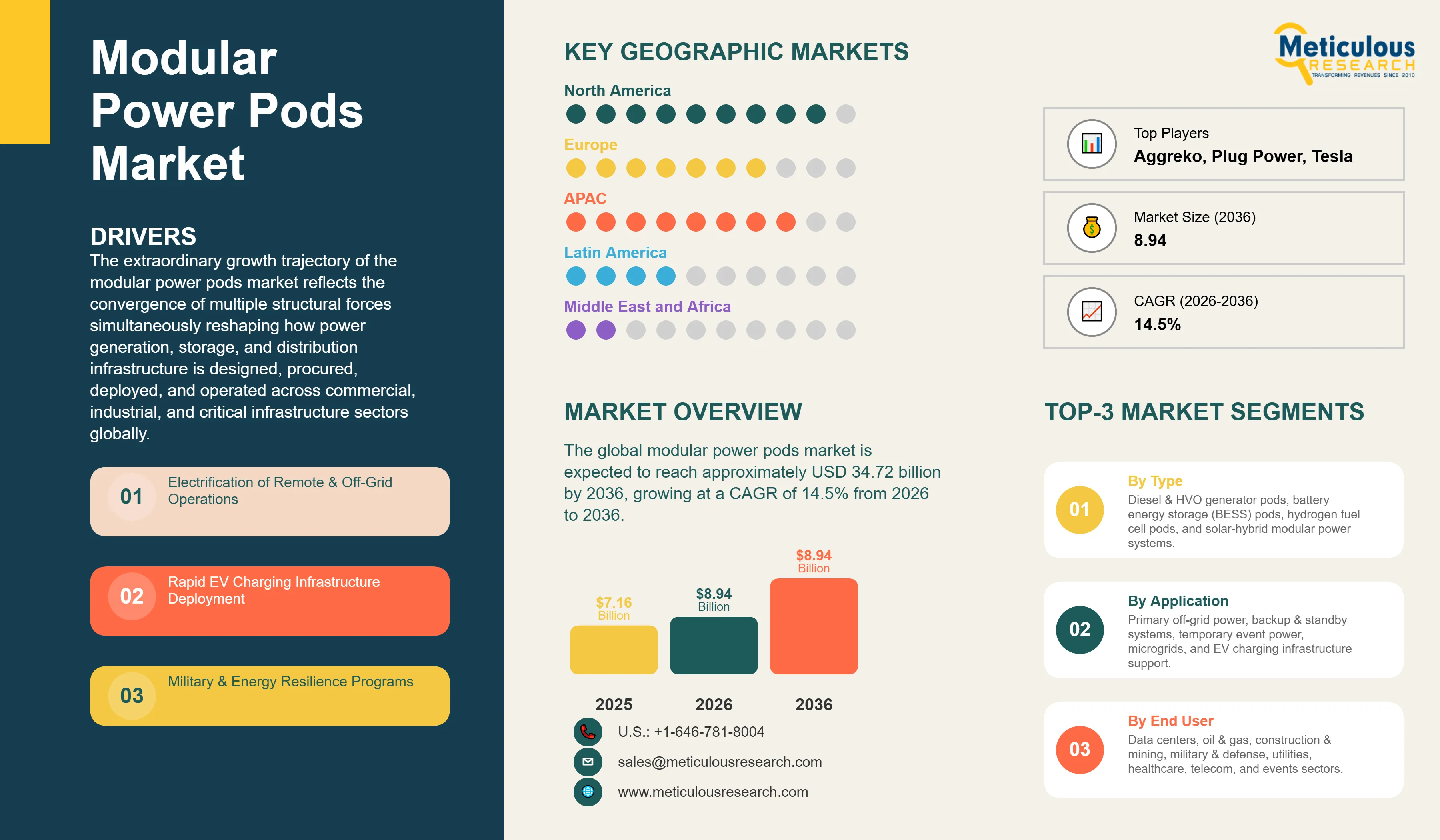 Report ID: MRSE - 1041835 Pages: 298 Mar-2026 Formats*: PDF Category: Semiconductor and Electronics Delivery: 24 to 72 Hours Download Free Sample ReportThe global modular power pods market was valued at USD 7.16 billion in 2025. The market is expected to reach approximately USD 34.72 billion by 2036 from USD 8.94 billion in 2026, growing at a CAGR of 14.5% from 2026 to 2036. The extraordinary growth trajectory of the modular power pods market reflects the convergence of multiple structural forces simultaneously reshaping how power generation, storage, and distribution infrastructure is designed, procured, deployed, and operated across commercial, industrial, and critical infrastructure sectors globally. Modular power pods — factory-assembled, self-contained power generation or energy storage systems integrated within standardized containerized or skid-mounted enclosures incorporating the generator or battery system, switchgear, monitoring electronics, cooling, safety systems, and connectivity interfaces as a fully tested and commissioned unit — deliver fundamentally different deployment economics compared to conventional field-constructed power infrastructure through dramatic reductions in installation time, civil engineering cost, and commissioning complexity. The addressable market for modular power pods spans an extraordinarily diverse range of applications — from temporary construction site power replacing diesel road tankers with clean hybrid systems, through permanent distributed generation for off-grid industrial operations, to multi-megawatt data center power infrastructure where modular pods enable capacity expansion without the 18-24 month construction timelines constraining conventional power infrastructure procurement. The electrification of remote and off-grid industrial operations, the data center capacity explosion driven by artificial intelligence workload growth, the global push for rapid EV charging infrastructure deployment, and the military's embrace of expeditionary power modularity collectively represent a multi-hundred-billion dollar addressable market that modular power pod technology is uniquely positioned to address through its combination of deployment speed, operational flexibility, and increasingly competitive lifecycle economics.