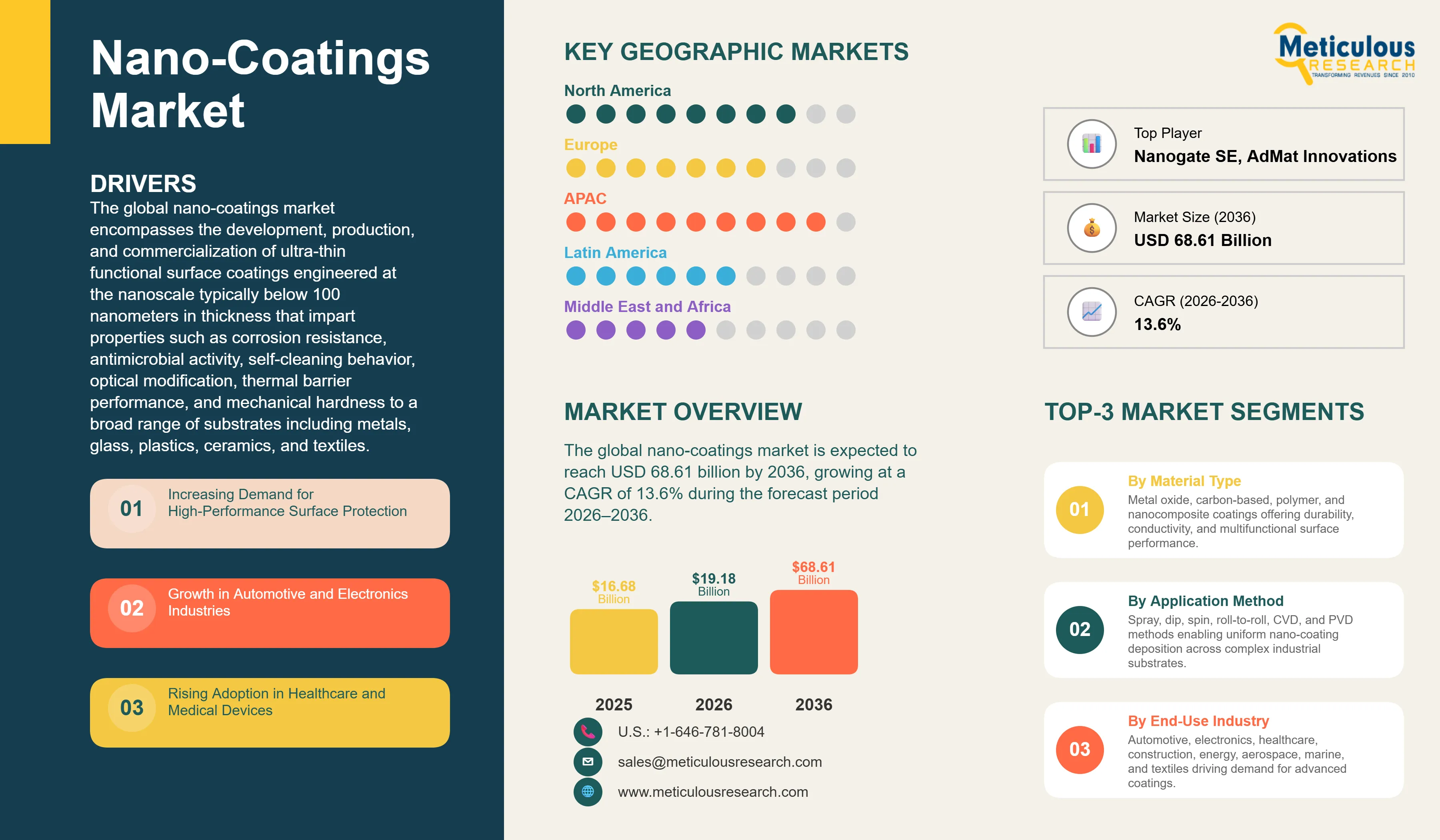 The growth of this market is primarily driven by the intensifying industrial demand for high-performance surface protection exceeding the capability of conventional coatings, the strong growth of automotive and electronics industries adopting nano-coating technologies for functional and aesthetic surface enhancement, the expanding renewable energy sector generating demand for efficiency-improving solar and wind nano-coatings, and the healthcare sector's growing adoption of antimicrobial nano-coatings for infection prevention and medical device surface treatment.