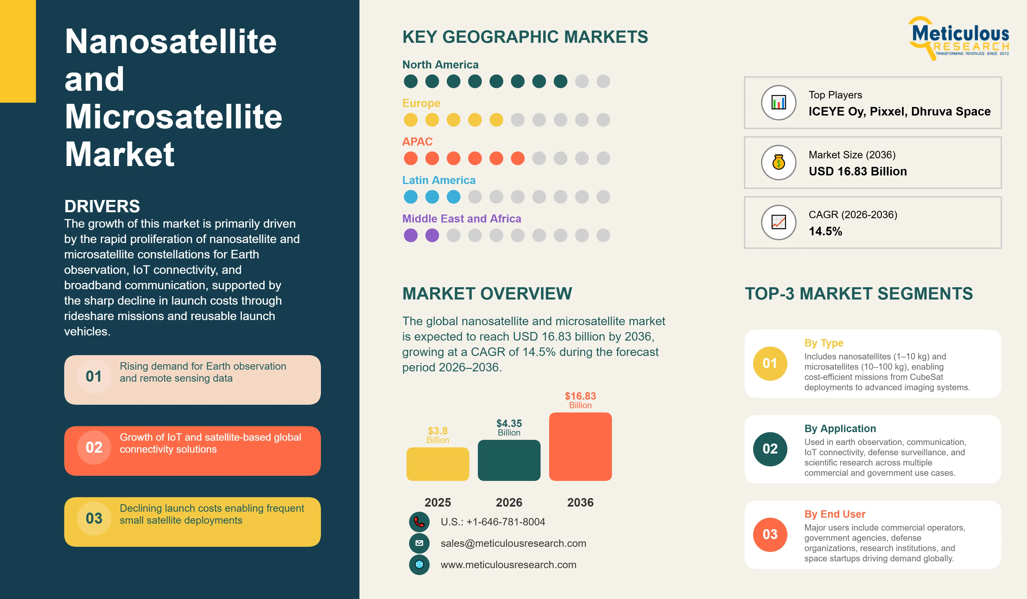 The global nanosatellite and microsatellite market is expected to reach USD 16.83 billion by 2036 from an estimated USD 4.35 billion in 2026, at a CAGR of 14.5% during the forecast period 2026–2036.