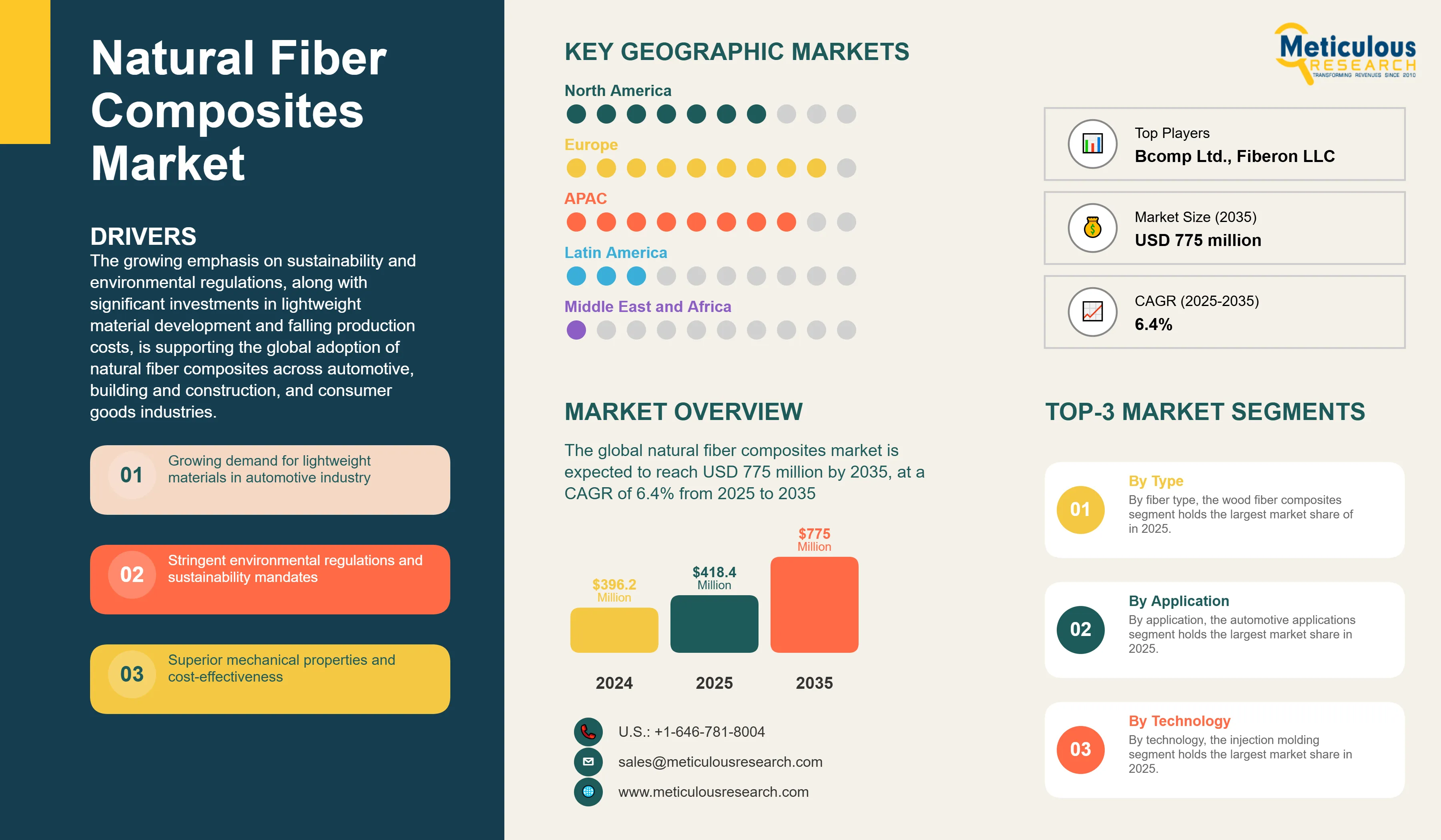 Natural Fiber Composites Market by Fiber Type (Wood, Hemp, Flax, Jute, Kenaf), Matrix Type (Thermoplastic, Thermoset, Bio-based Polymers), Technology (Compression Molding, Injection Molding, RTM, Vacuum Infusion), Application, and Geography—Global Forecast to 2035