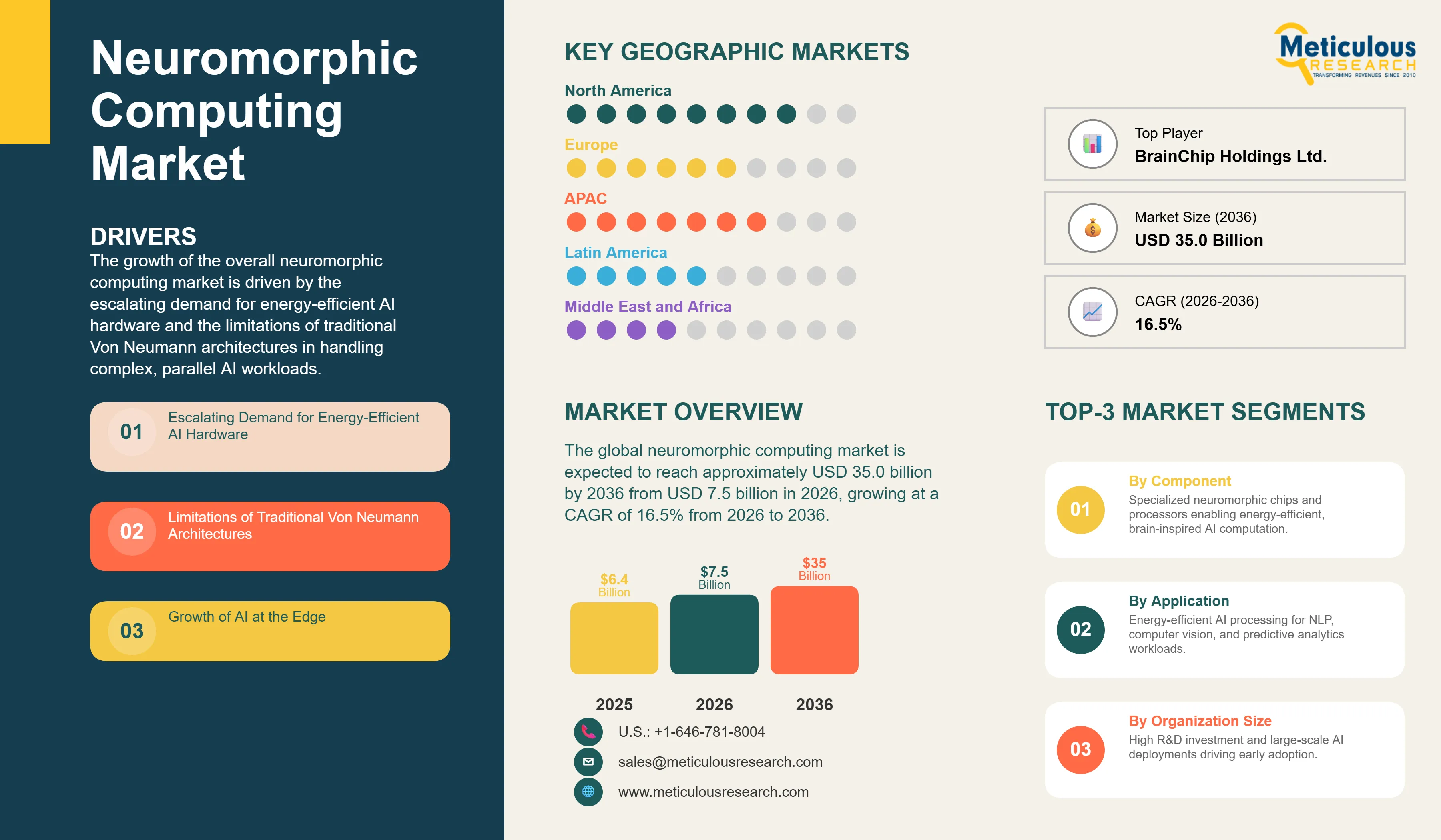 Report ID: MRSE - 1041809 Pages: 272 Feb-2026 Formats*: PDF Category: Semiconductor and Electronics Delivery: 24 to 72 Hours Download Free Sample ReportThe global neuromorphic computing market was valued at USD 6.4 billion in 2025. The market is expected to reach approximately USD 35.0 billion by 2036 from USD 7.5 billion in 2026, growing at a CAGR of 16.5% from 2026 to 2036. The growth of the overall neuromorphic computing market is driven by the escalating demand for energy-efficient AI hardware and the limitations of traditional Von Neumann architectures in handling complex, parallel AI workloads. As organizations increasingly deploy AI at the edge, the need for brain-inspired architectures that deliver high performance with minimal power consumption has become critical. The expansion of IoT ecosystems, the rise of autonomous systems, and the pursuit of more biologically plausible AI models are further compelling enterprises and research institutions to transition toward neuromorphic platforms. At the same time, the rapid development of spiking neural networks (SNNs) and event-driven processing is reinforcing the need for hardware that can natively support these advanced computational paradigms—a capability that neuromorphic chips are uniquely positioned to provide.