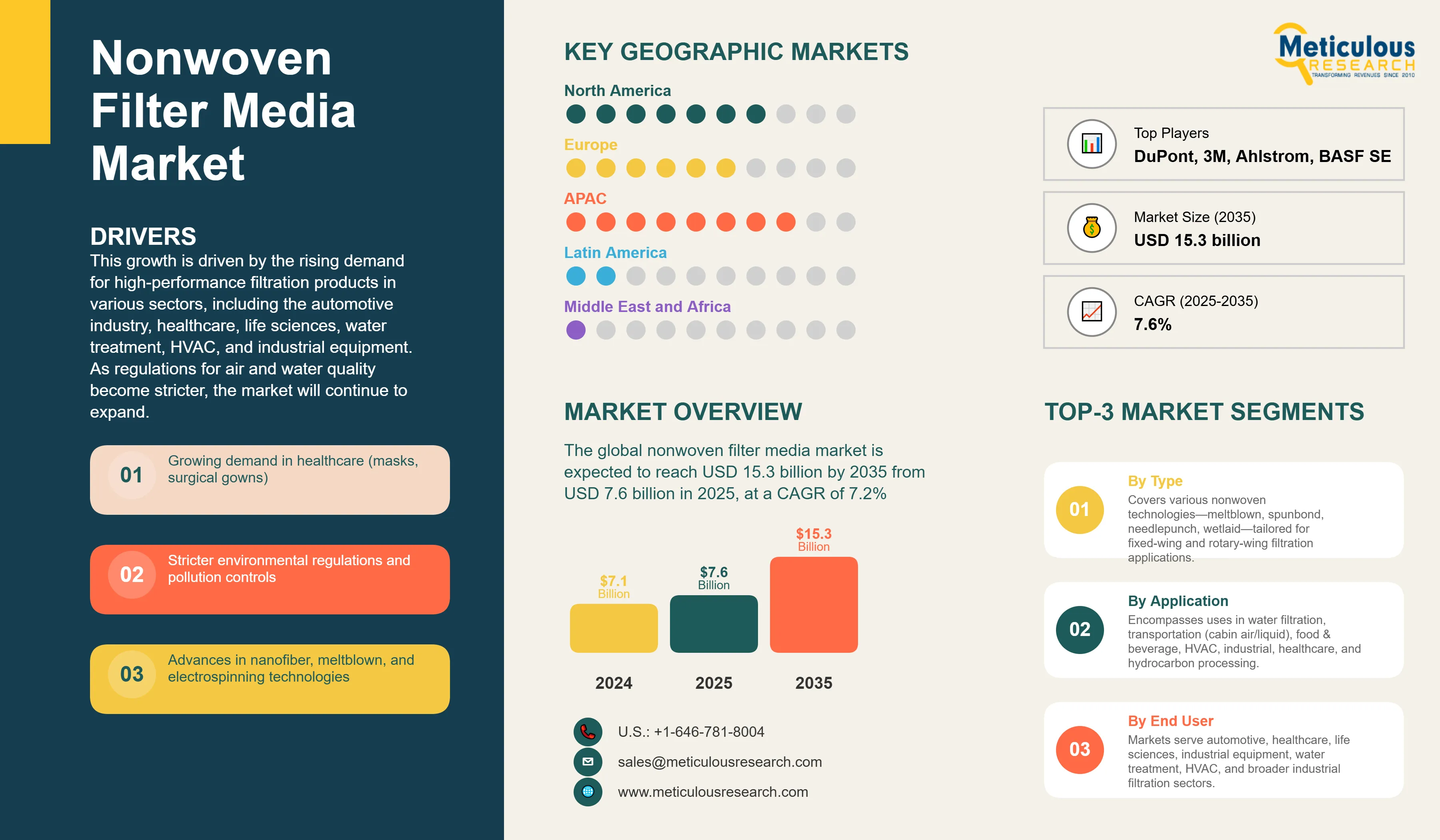 With a growing global focus on sustainability and stricter regulatory compliance, nonwoven filter media are expected to play a key role in providing clean air, safe water, and industrial safety across various industries.