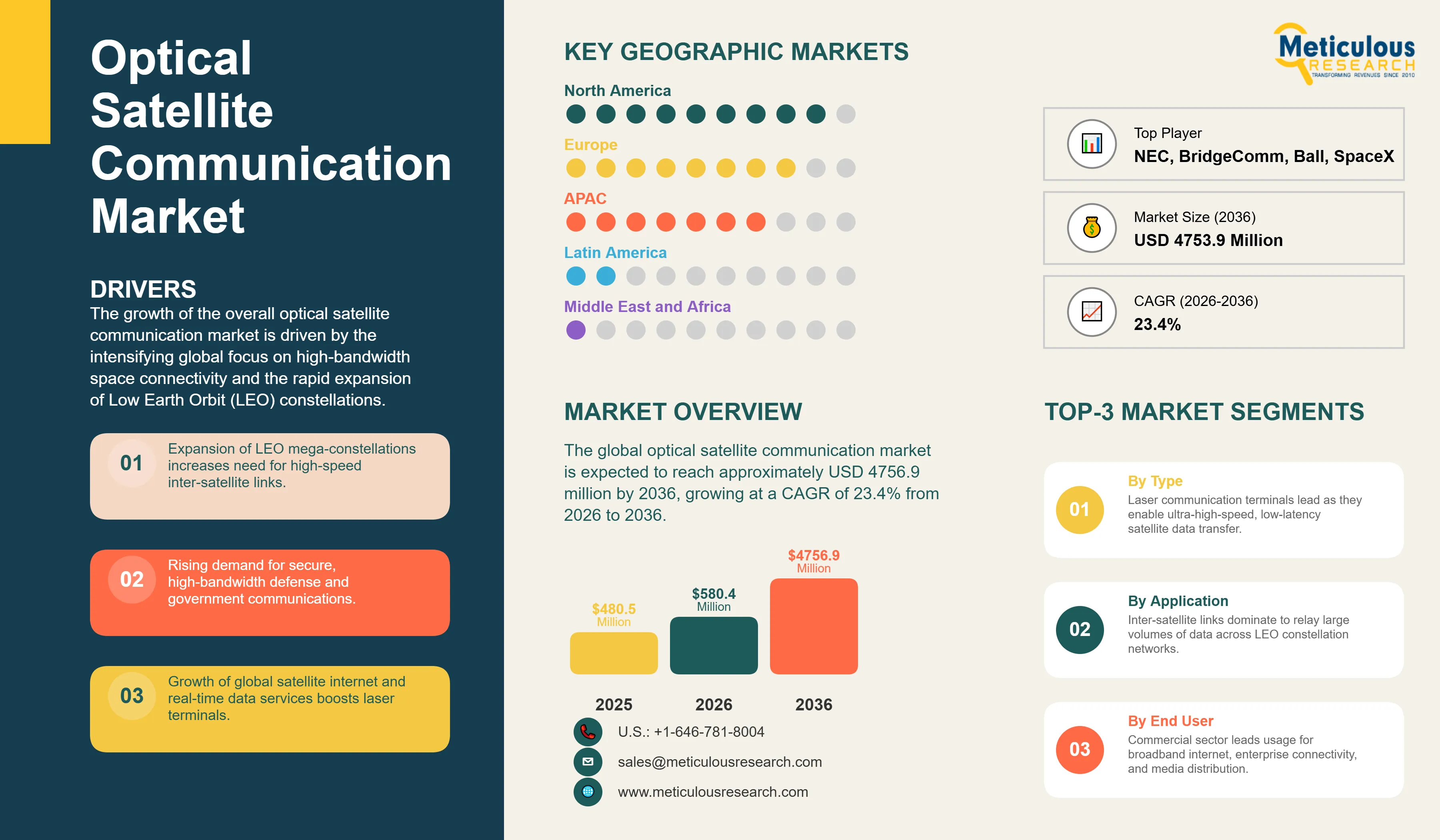 Report ID: MRSE - 1041782 Pages: 284 Feb-2026 Formats*: PDF Category: Semiconductor and Electronics Delivery: 24 to 72 Hours Download Free Sample ReportThe global optical satellite communication market was valued at USD 480.5 million in 2025. The market is expected to reach approximately USD 4756.9 million by 2036 from USD 580.4 million in 2026, growing at a CAGR of 23.4% from 2026 to 2036. The growth of the overall optical satellite communication market is driven by the intensifying global focus on high-bandwidth space connectivity and the rapid expansion of Low Earth Orbit (LEO) constellations. As satellite operators seek to integrate more functionality into inter-satellite links (ISL) and direct-to-earth (DTE) systems, laser communication terminals have become essential for maintaining high-performance data transmission and operational reliability. The rapid expansion of mega-constellation initiatives and the increasing need for high-reliability secure communication in government and defense complexes continue to fuel significant growth of this market across all major geographic regions.