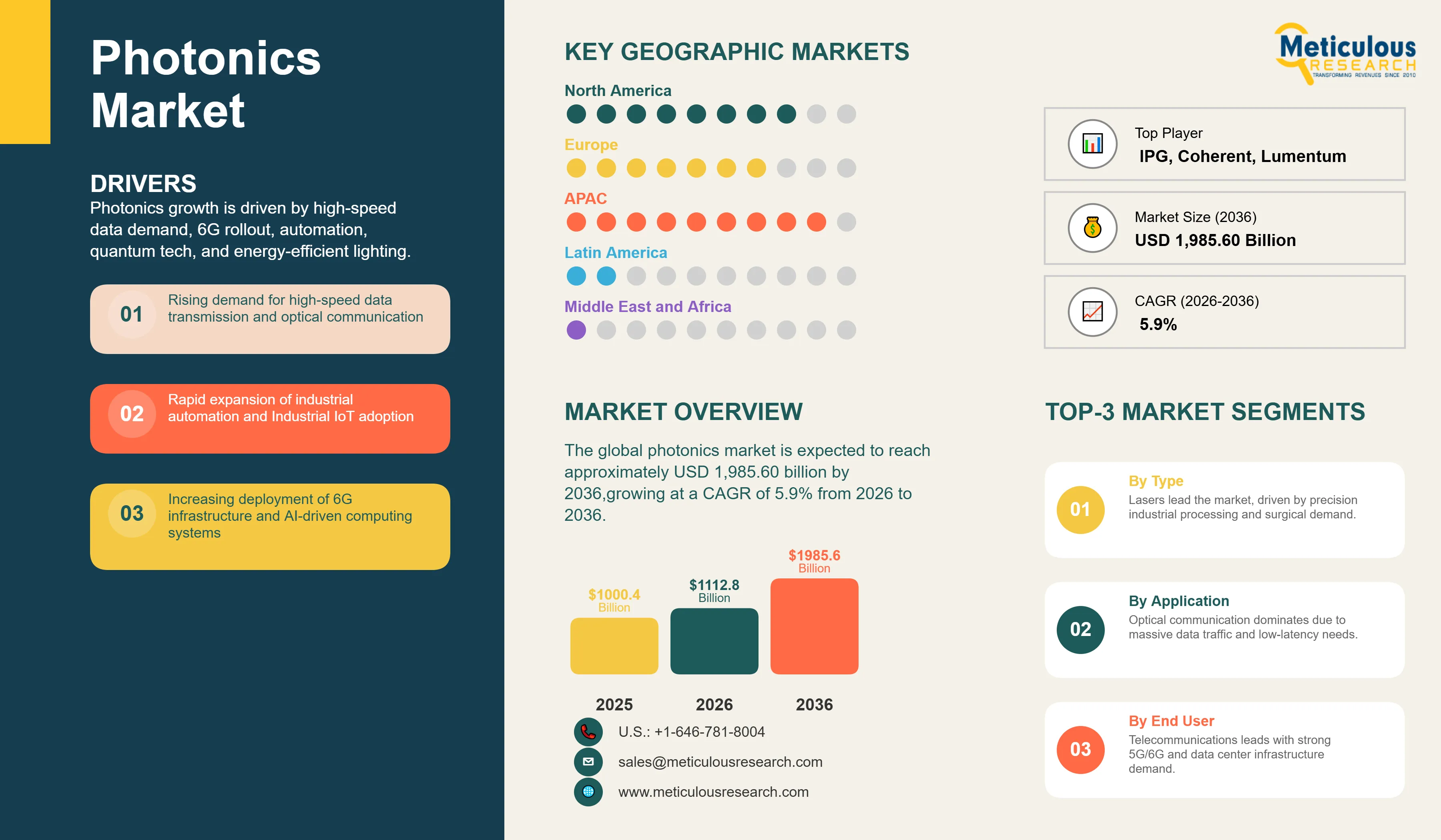 Photonics Market by Product Type (Lasers, LEDs, Sensors & Detectors, Optical Components & Systems, Others), Application (Optical Communication, Displays, Lighting, Medical Technology, Manufacturing), and End-User Industry (Telecommunications, Healthcare, Industrial, Consumer Electronics) – Global Forecast to 2036