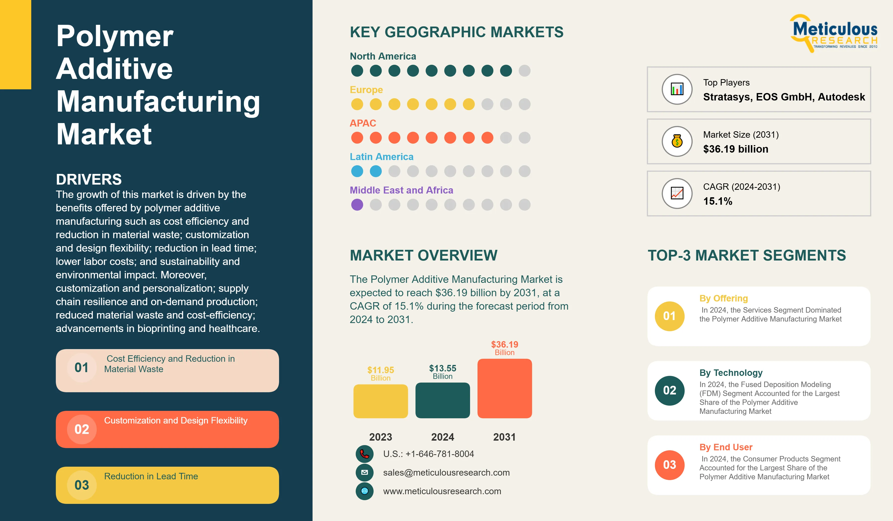 The primary drivers of polymer additive manufacturing market growth include advantages of polymer additive manufacturing such as cost efficiency and reduction in material waste; customization and design flexibility; reduction in lead time; lower labor costs; and sustainability and environmental impact.