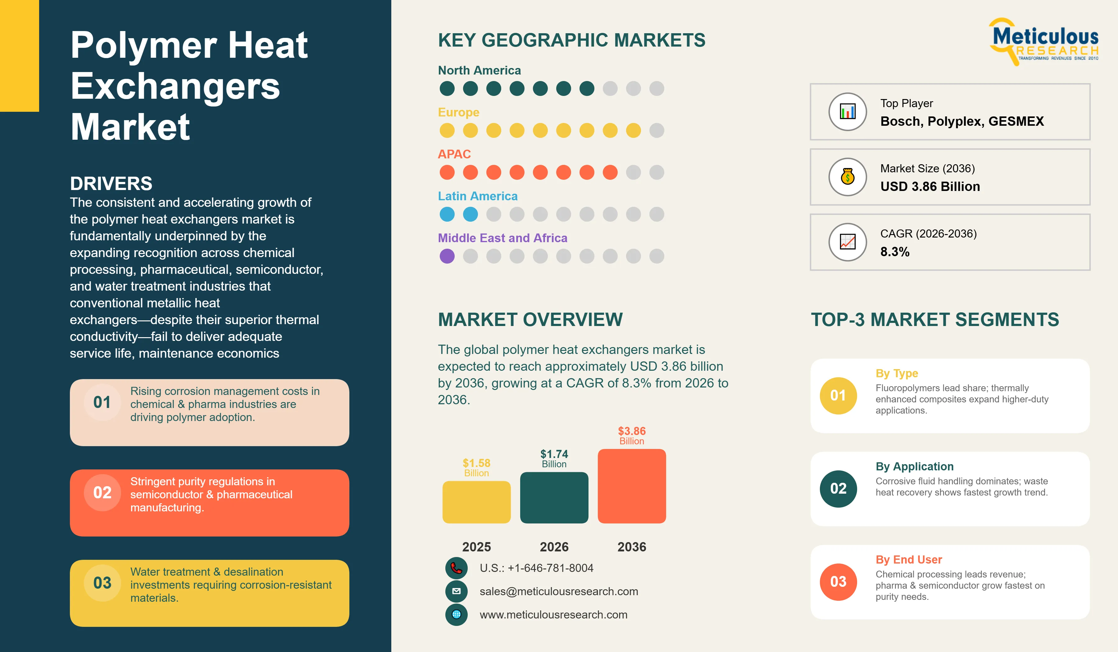 Report ID: MRSE - 1041834 Pages: 277 Mar-2026 Formats*: PDF Category: Semiconductor and Electronics Delivery: 24 to 72 Hours Download Free Sample ReportThe global polymer heat exchangers market was valued at USD 1.58 billion in 2025. The market is expected to reach approximately USD 3.86 billion by 2036 from USD 1.74 billion in 2026, growing at a CAGR of 8.3% from 2026 to 2036. The consistent and accelerating growth of the polymer heat exchangers market is fundamentally underpinned by the expanding recognition across chemical processing, pharmaceutical, semiconductor, and water treatment industries that conventional metallic heat exchangers — despite their superior thermal conductivity — fail to deliver adequate service life, maintenance economics, or product purity requirements in applications involving highly corrosive process fluids, ultra-pure water systems, and aggressive cleaning regimes. Polymer heat exchangers, engineered from fluoropolymers including polytetrafluoroethylene and polyvinylidene fluoride, polypropylene, polyether ether ketone, and advanced high-performance thermoplastics, deliver exceptional chemical resistance spanning virtually the entire pH spectrum from concentrated acids to strong caustics, inherent non-fouling surfaces minimizing cleaning frequency and downtime, and elimination of metallic ion contamination that compromises product quality in pharmaceutical and semiconductor applications. The convergence of advancing polymer processing technologies enabling fabrication of increasingly complex heat exchanger geometries, growing regulatory scrutiny of metallic contamination in food, pharmaceutical, and electronics manufacturing, and escalating operational cost pressures driving demand for longer-life, lower-maintenance thermal management solutions is creating powerful and sustained market growth momentum across multiple high-value industrial segments globally.
