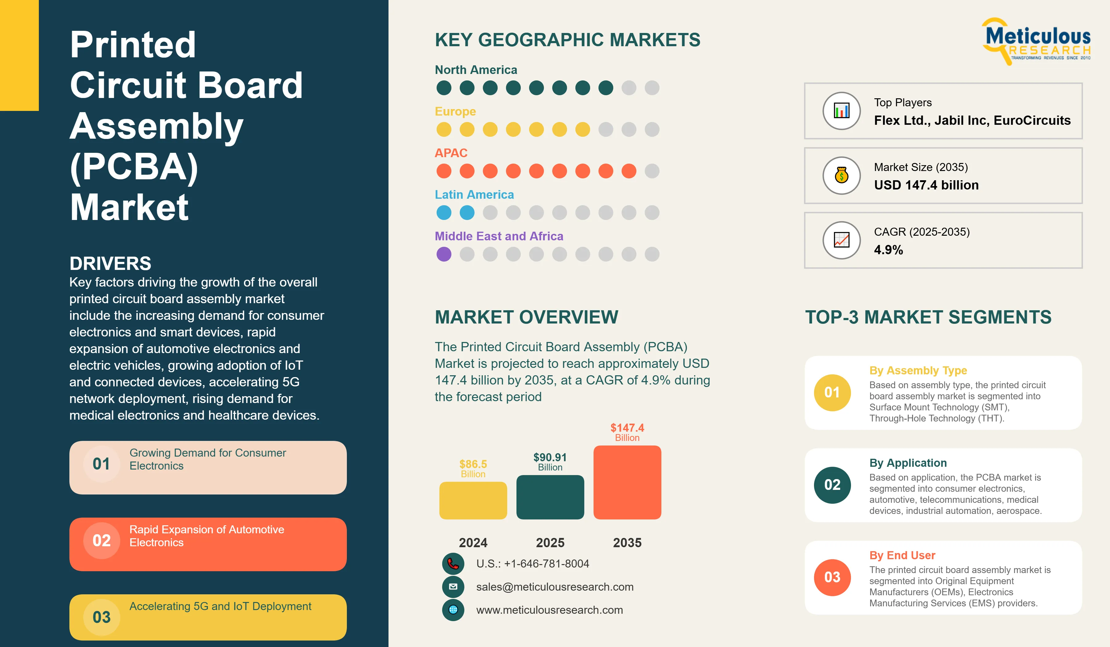 Key factors driving the growth of the overall printed circuit board assembly market include the increasing demand for consumer electronics and smart devices, rapid expansion of automotive electronics and electric vehicles, growing adoption of IoT and connected devices, accelerating 5G network deployment, rising demand for medical electronics and healthcare devices, and continuous miniaturization trends requiring advanced assembly technologies. However, this growth is restrained by volatile raw material costs and supply chain disruptions, complex regulatory compliance requirements across different regions, increasing labor costs in traditional manufacturing hubs, and technical challenges in assembling high-density interconnect boards.