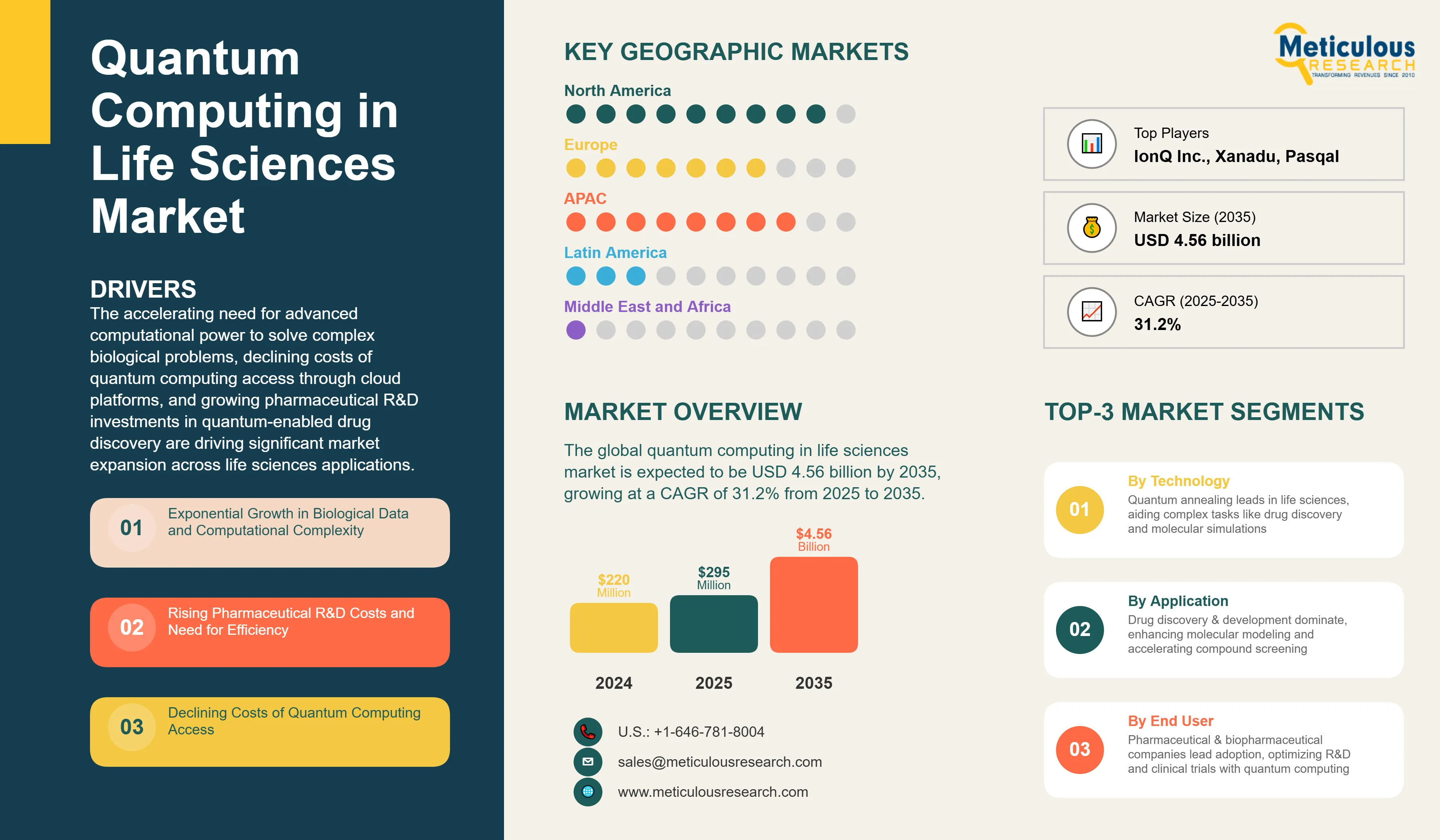 The global quantum computing in life sciences market was valued at USD 220 million in 2024. This market is expected to be USD 4.56 billion by 2035 from an estimated USD 295 million in 2025, growing at a CAGR of 31.2% from 2025 to 2035. The increasing need for advanced computational power to solve complex biological problems, declining costs of quantum computing access through cloud platforms, and growing pharmaceutical R&D investments in quantum-enabled drug discovery are driving significant market expansion across life sciences applications.