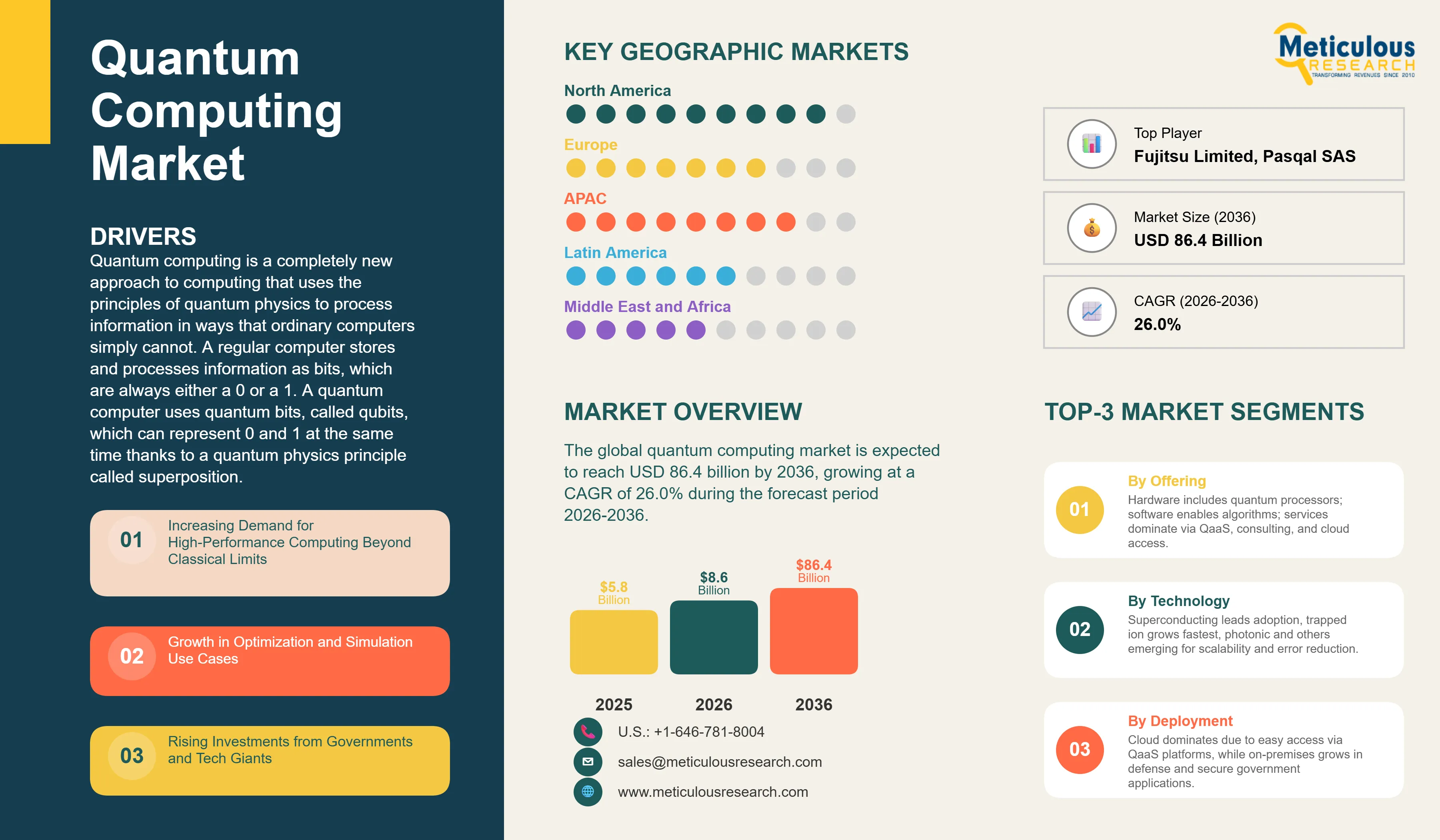 The global quantum computing market is expected to reach USD 86.4 billion by 2036 from an estimated USD 8.6 billion in 2026, at a CAGR of 26.0% during the forecast period 2026-2036.