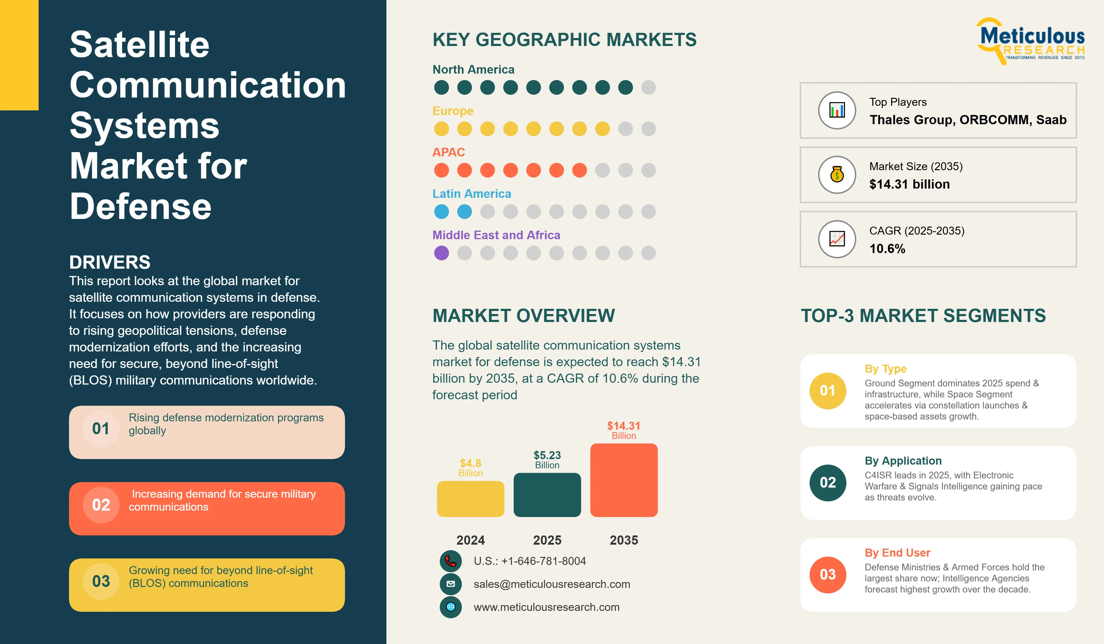 This report looks at the global market for satellite communication systems in defense. It focuses on how providers are responding to rising geopolitical tensions, defense modernization efforts, and the increasing need for secure, beyond line-of-sight (BLOS) military communications worldwide. It evaluates market dynamics, forecasts growth through 2035, and examines competitive positioning on global and regional/country levels.