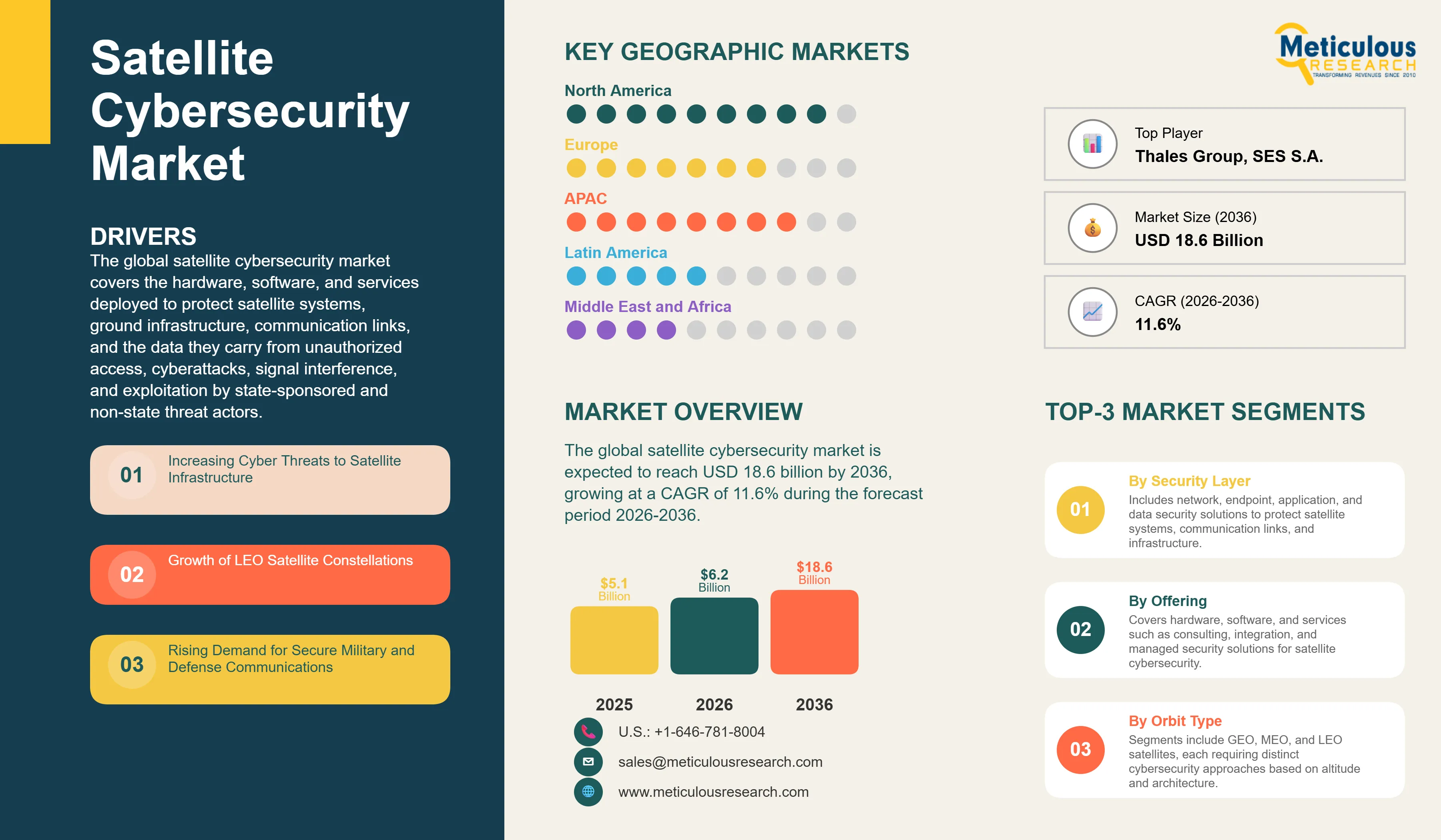 The global satellite cybersecurity market is expected to reach USD 18.6 billion by 2036 from an estimated USD 6.2 billion in 2026, at a CAGR of 11.6% during the forecast period 2026-2036.