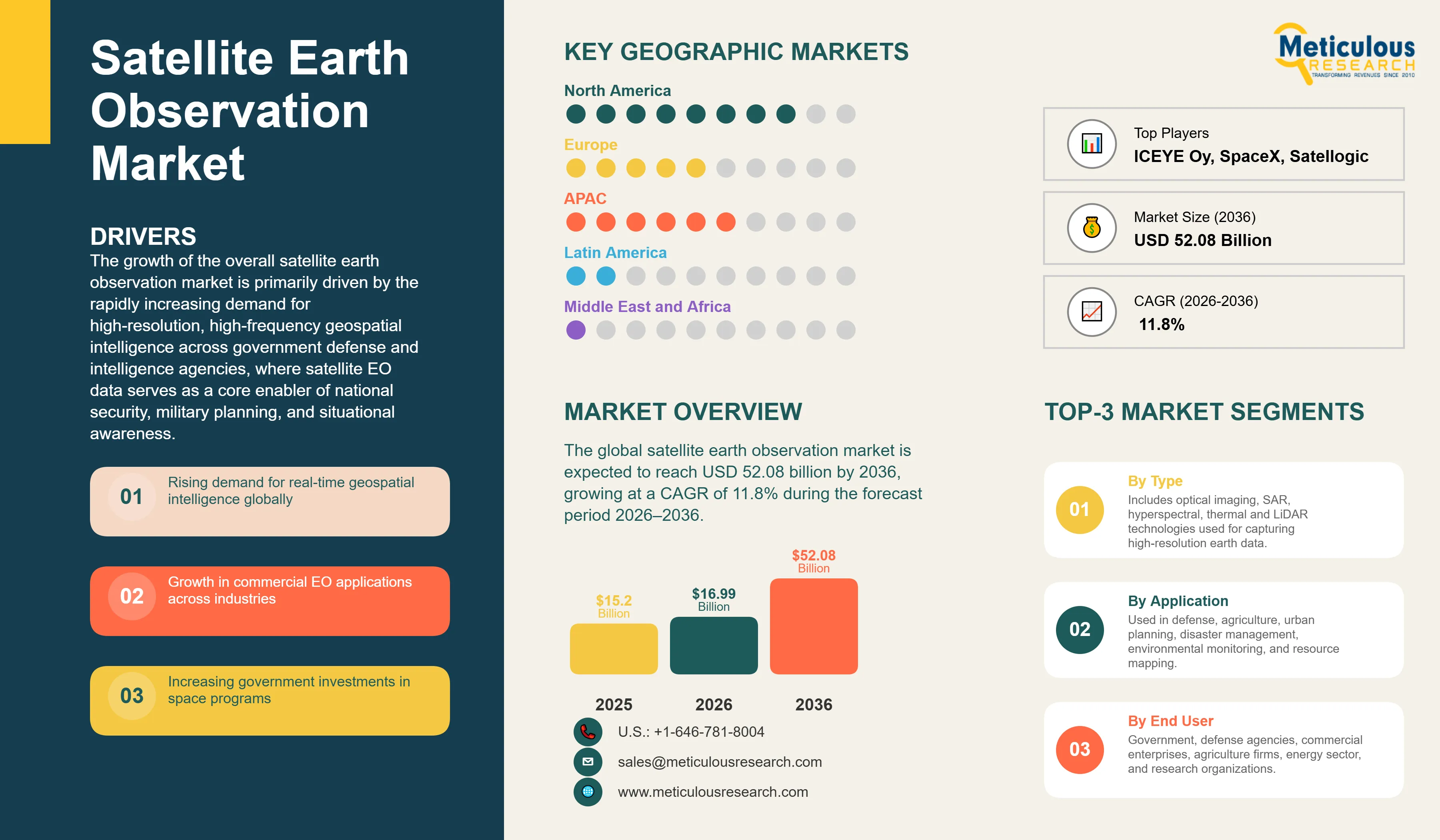 The global satellite earth observation market was valued at USD 15.20 billion in 2025. This market is expected to reach USD 52.08 billion by 2036 from an estimated USD 16.99 billion in 2026, growing at a CAGR of 11.8% during the forecast period 2026–2036.