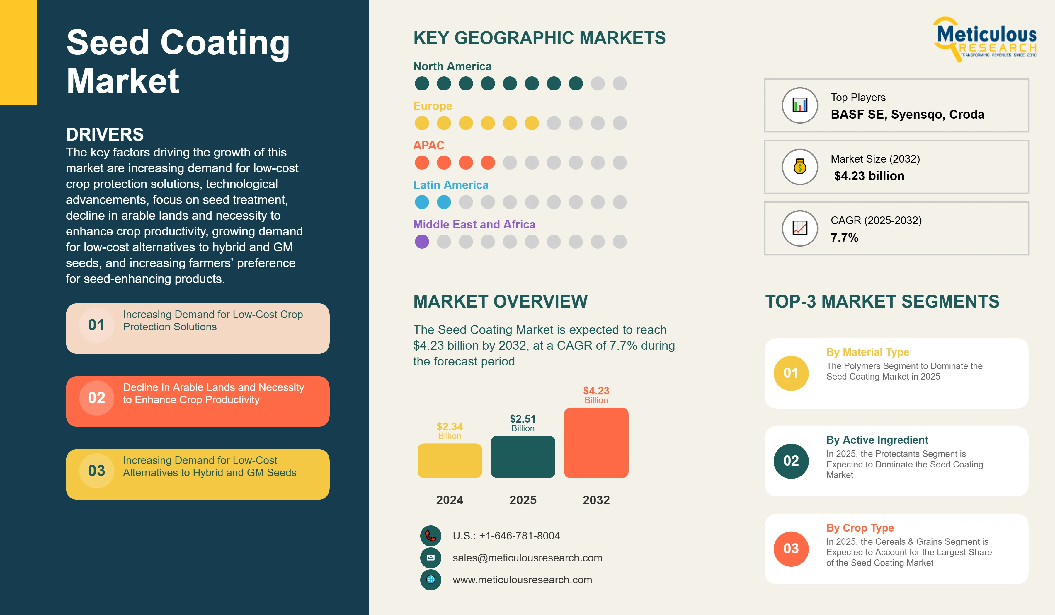 The increasing demand for low-cost crop protection solutions, technological advancements, focus on seed treatment, decline in arable lands and necessity to enhance crop productivity, growing demand for low-cost alternatives to hybrid and GM seeds, and increasing farmers’ preference for seed-enhancing products drives the growth of this market.