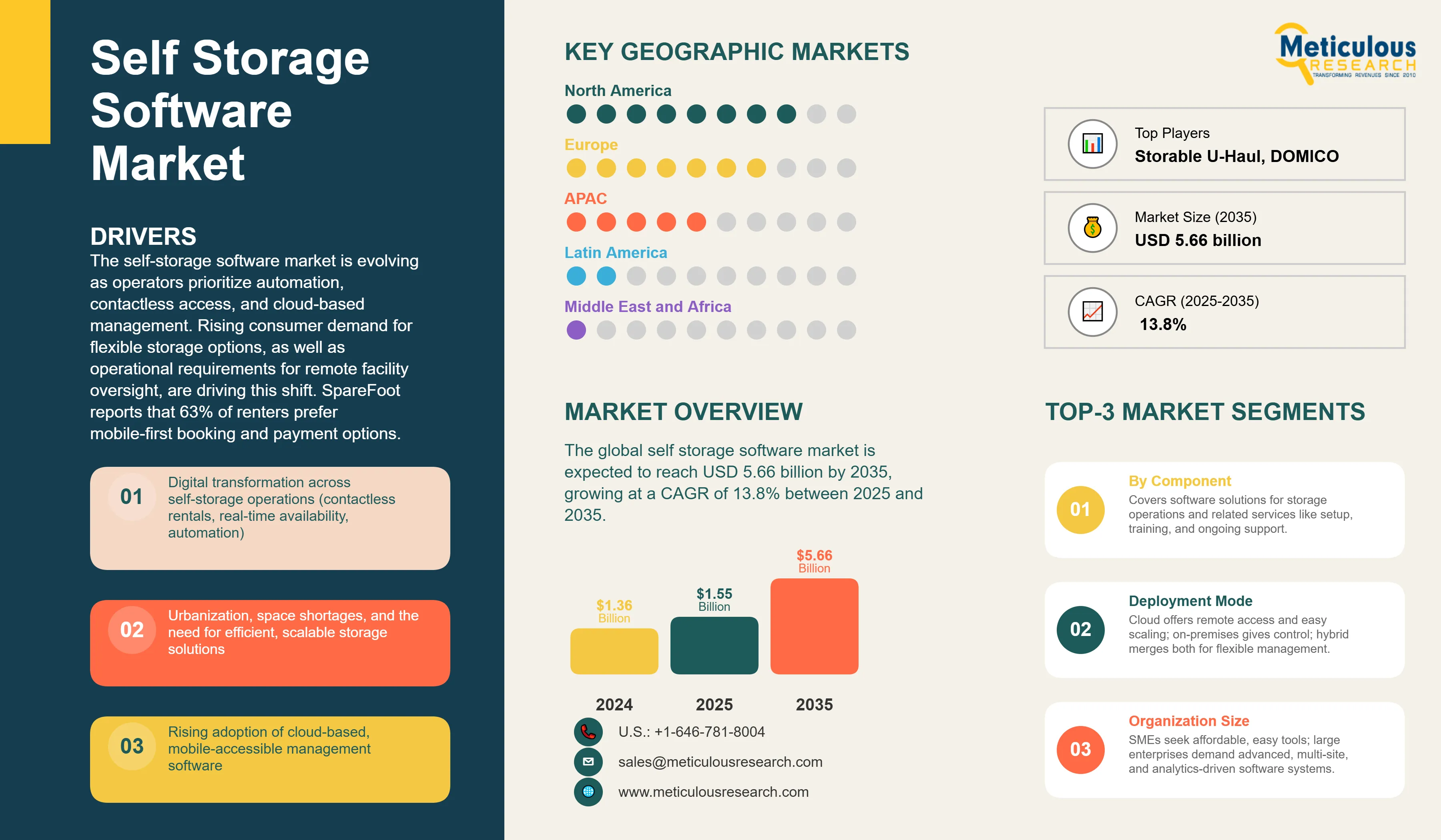 The self-storage software market is evolving as operators prioritize automation, contactless access, and cloud-based management. Rising consumer demand for flexible storage options, as well as operational requirements for remote facility oversight, are driving this shift. SpareFoot reports that 63% of renters prefer mobile-first booking and payment options. As urbanization and e-commerce logistics grow, so does the demand for scalable, automated software solutions in North America, Europe, and Asia Pacific. The market outlook remains positive, with operators investing in AI-powered analytics, IoT integrations, and customer self-service portals to improve efficiency and user experience.