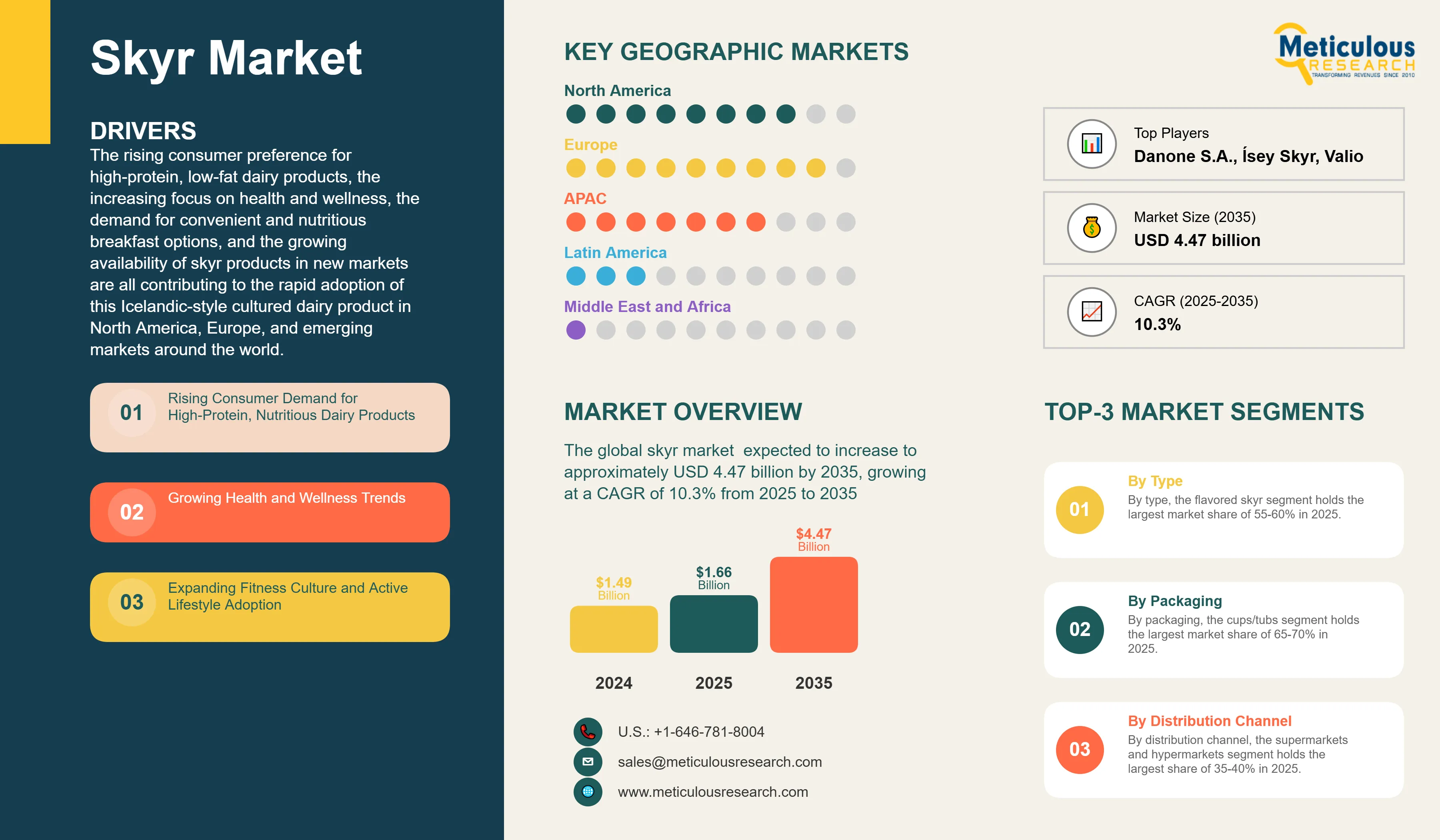 The skyr market is expected to increase from USD 1.66 billion in 2025 to USD 4.47 billion by 2035.