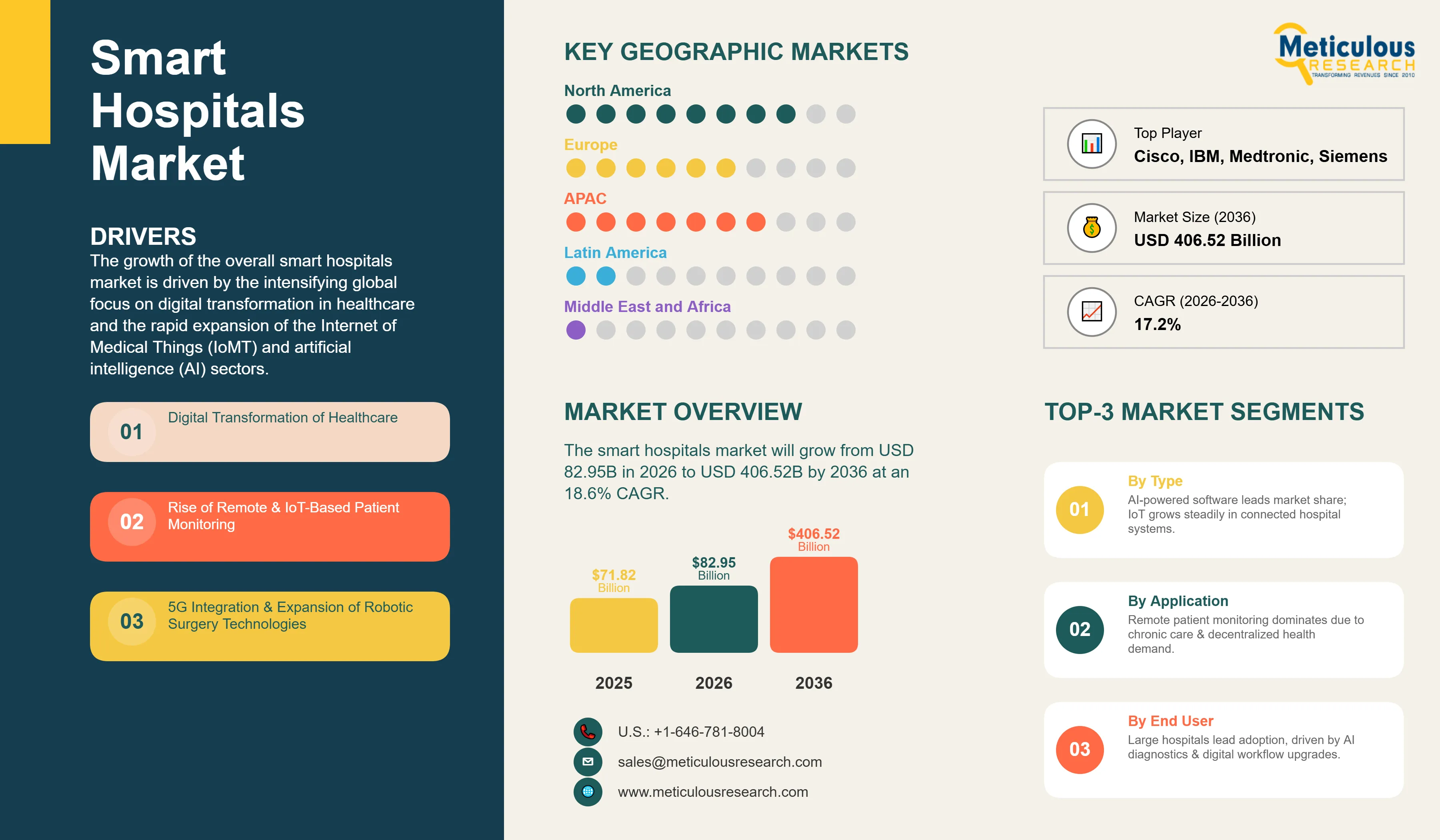 Report ID: MRHC - 1041706 Pages: 215 Feb-2026 Formats*: PDF Category: Healthcare Delivery: 24 to 72 Hours Download Free Sample ReportThe global smart hospitals market was valued at USD 71.82 billion in 2025. The market is expected to reach approximately USD 406.52 billion by 2036 from USD 82.95 billion in 2026, growing at a CAGR of 18.6% from 2026 to 2036. The growth of the overall smart hospitals market is driven by the intensifying global focus on digital transformation in healthcare and the rapid expansion of the Internet of Medical Things (IoMT) and artificial intelligence (AI) sectors. As healthcare providers seek to integrate more functionality into clinical workflows and patient management systems, smart hospital infrastructure has become essential for maintaining high-quality patient outcomes and operational efficiency. The rapid expansion of 5G infrastructure and the increasing need for real-time data analytics in remote patient monitoring and robotic-assisted surgeries continue to fuel significant growth of this market across all major geographic regions.