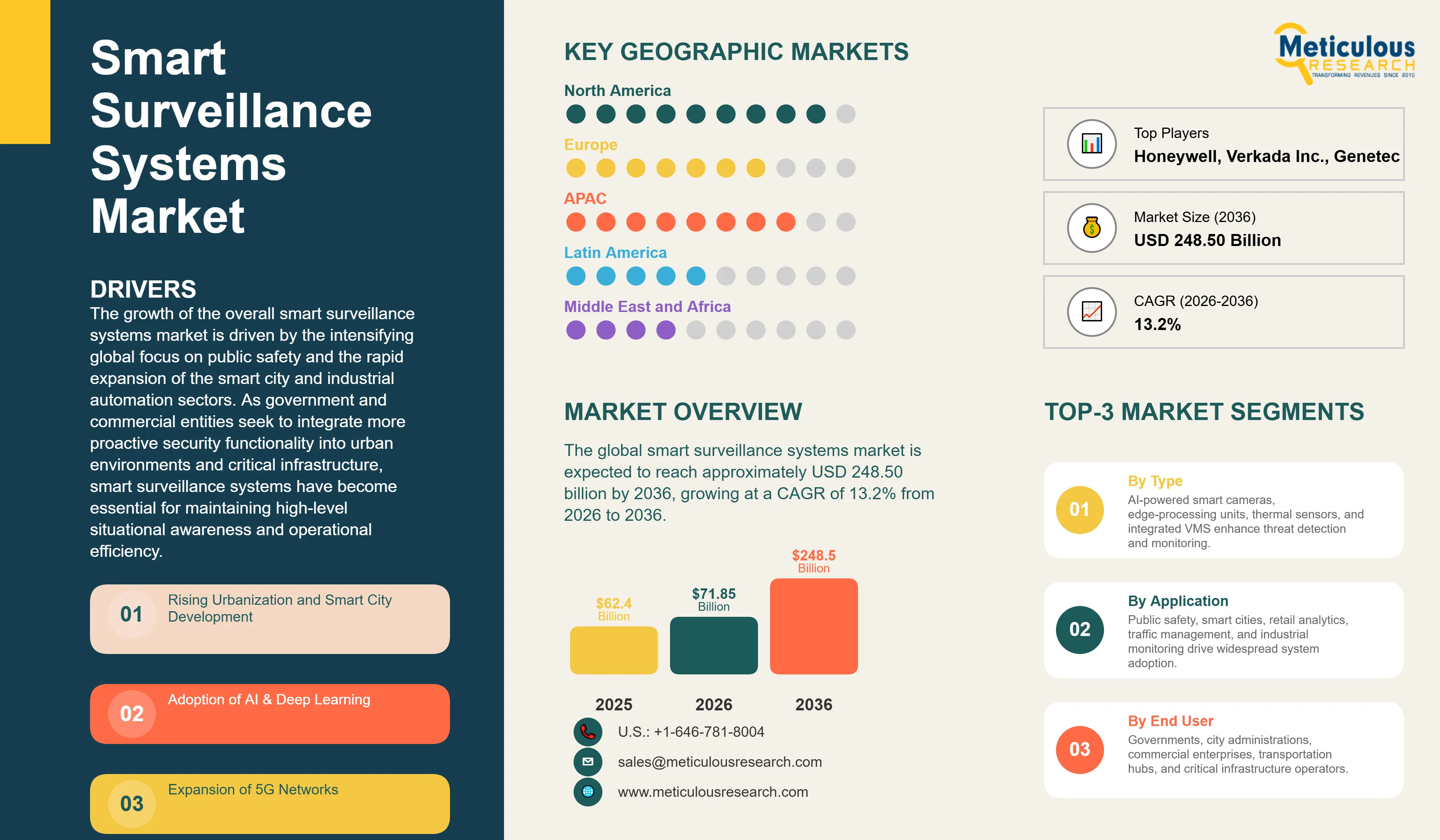 Report ID: MRSE - 1041736 Pages: 251 Feb-2026 Formats*: PDF Category: Semiconductor and Electronics Delivery: 24 to 72 Hours Download Free Sample ReportThe global smart surveillance systems market was valued at USD 62.40 billion in 2025. The market is expected to reach approximately USD 248.50 billion by 2036 from USD 71.85 billion in 2026, growing at a CAGR of 13.2% from 2026 to 2036. The growth of the overall smart surveillance systems market is driven by the intensifying global focus on public safety and the rapid expansion of the smart city and industrial automation sectors. As government and commercial entities seek to integrate more proactive security functionality into urban environments and critical infrastructure, smart surveillance systems have become essential for maintaining high-level situational awareness and operational efficiency. The rapid expansion of 5G infrastructure and the increasing need for real-time edge analytics in autonomous monitoring and forensic investigations continue to fuel significant growth of this market across all major geographic regions.