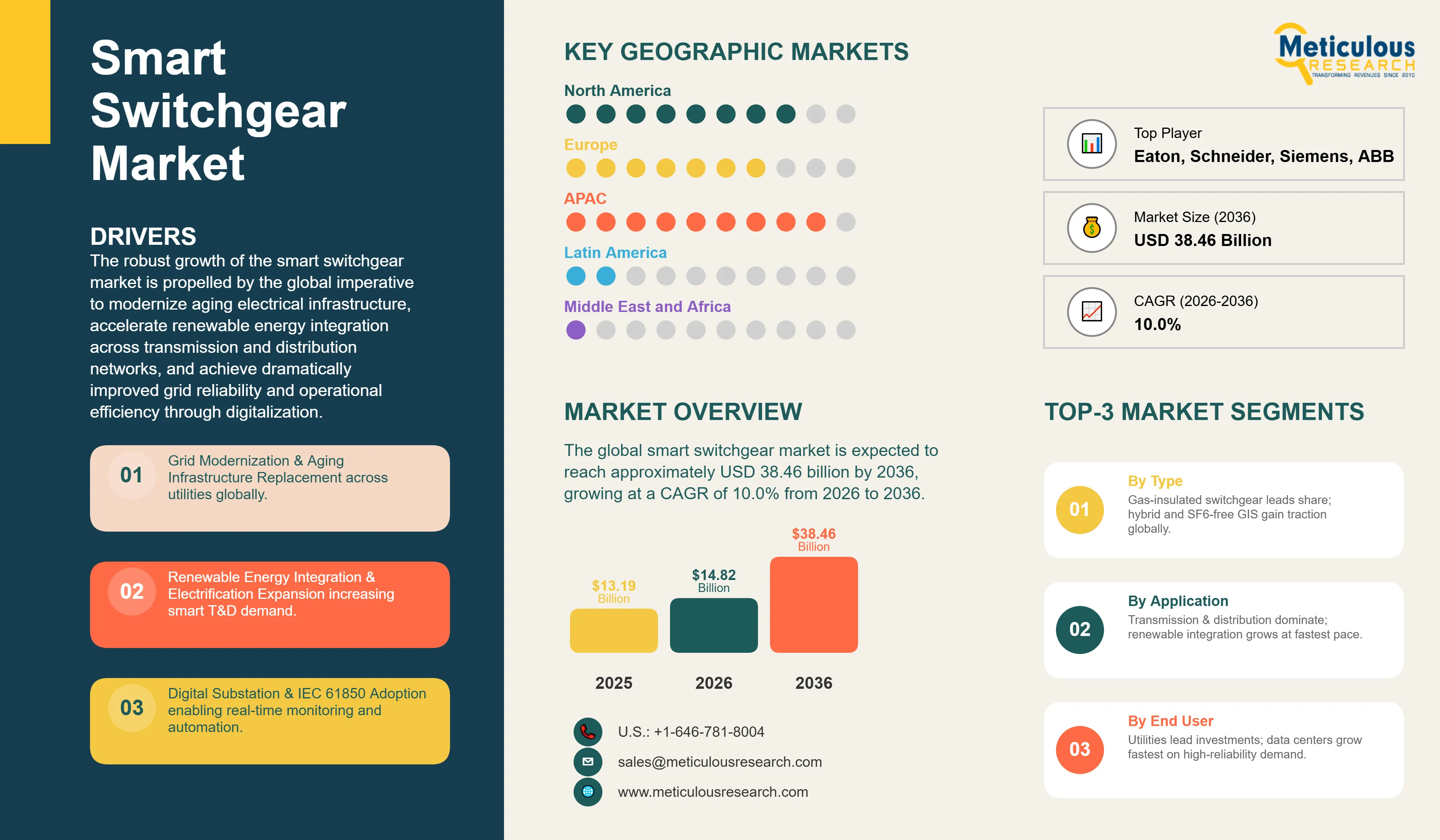 Report ID: MRSE - 1041832 Pages: 311 Mar-2026 Formats*: PDF Category: Semiconductor and Electronics Delivery: 24 to 72 Hours Download Free Sample ReportThe global smart switchgear market was valued at USD 13.19 billion in 2025. The market is expected to reach approximately USD 38.46 billion by 2036 from USD 14.82 billion in 2026, growing at a CAGR of 10.0% from 2026 to 2036. The robust growth of the smart switchgear market is propelled by the global imperative to modernize aging electrical infrastructure, accelerate renewable energy integration across transmission and distribution networks, and achieve dramatically improved grid reliability and operational efficiency through digitalization. As power utilities, industrial operators, and governments confront the dual challenge of transitioning energy systems toward decarbonization while ensuring uninterrupted power supply to increasingly electricity-dependent economies, smart switchgear — integrating advanced sensing, communications, automation, and self-diagnostic capabilities into traditional switching apparatus — has emerged as the foundational infrastructure element enabling the intelligent, flexible, and resilient electrical grids of the future. The convergence of IEC 61850 digital substation standards, Industrial Internet of Things platforms enabling real-time asset health monitoring, and AI-powered predictive maintenance analytics is transforming switchgear from passive electrical isolation equipment into active, communicating nodes within comprehensive grid intelligence architectures.