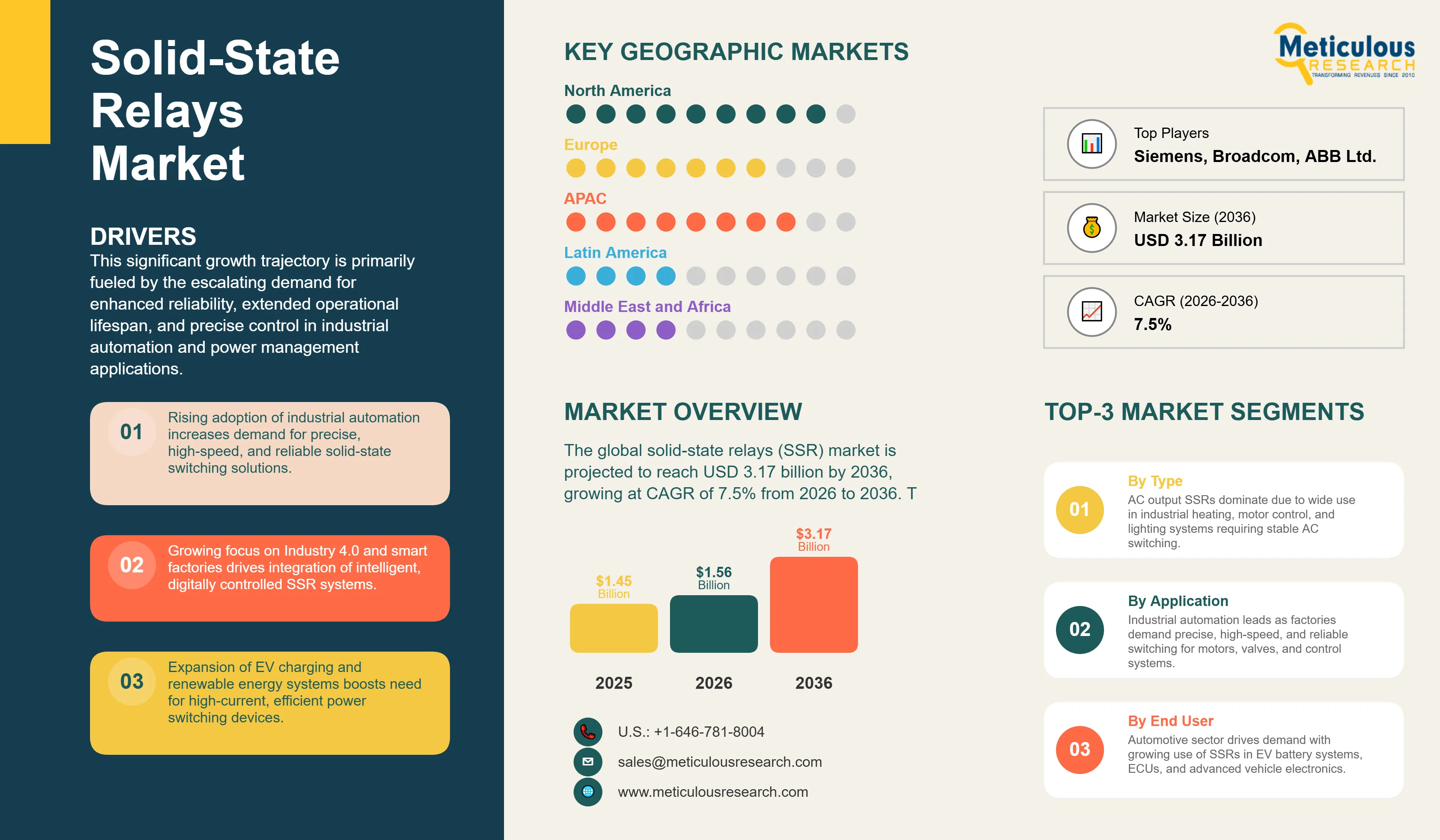 Report ID: MRSE - 1041826 Pages: 267 Mar-2026 Formats*: PDF Category: Semiconductor and Electronics Delivery: 24 to 72 Hours Download Free Sample ReportThe global solid-state relays (SSR) market was valued at USD 1.45 billion in 2025. The market is projected to reach USD 3.17 billion by 2036 from USD 1.56 billion in 2026, growing at CAGR of 7.5% from 2026 to 2036. This significant growth trajectory is primarily fueled by the escalating demand for enhanced reliability, extended operational lifespan, and precise control in industrial automation and power management applications. Key drivers include the increasing adoption of automation across manufacturing sectors, the miniaturization of electronic components, and stringent safety regulations necessitating robust switching solutions. Furthermore, continuous advancements in semiconductor technology, the integration of smart control features, and the growing demand for energy-efficient solutions are collectively enhancing the efficacy and market appeal of solid-state relays worldwide.