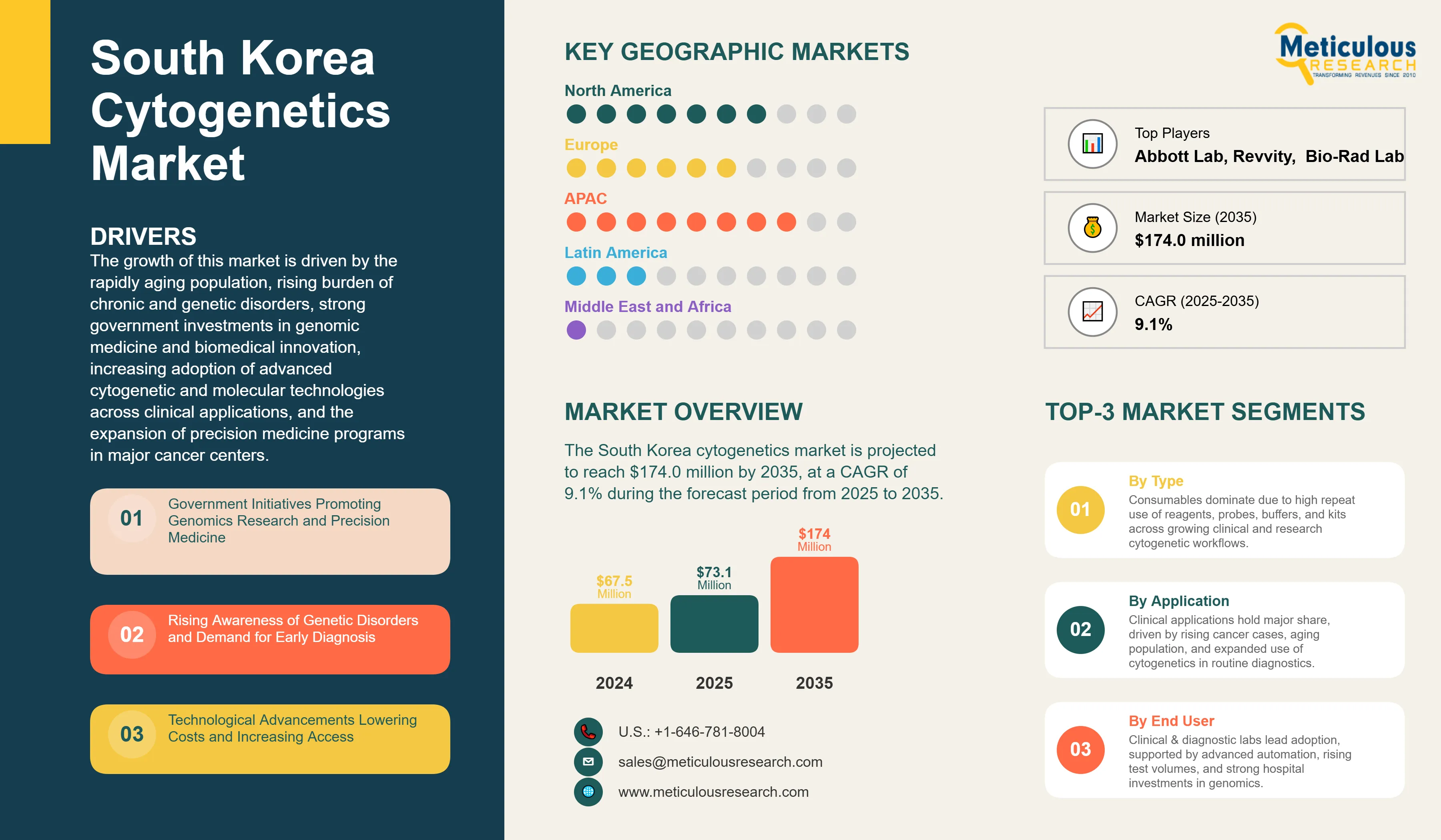 The South Korea cytogenetics market is projected to reach $174.0 million by 2035, at a CAGR of 9.1% during the forecast period.