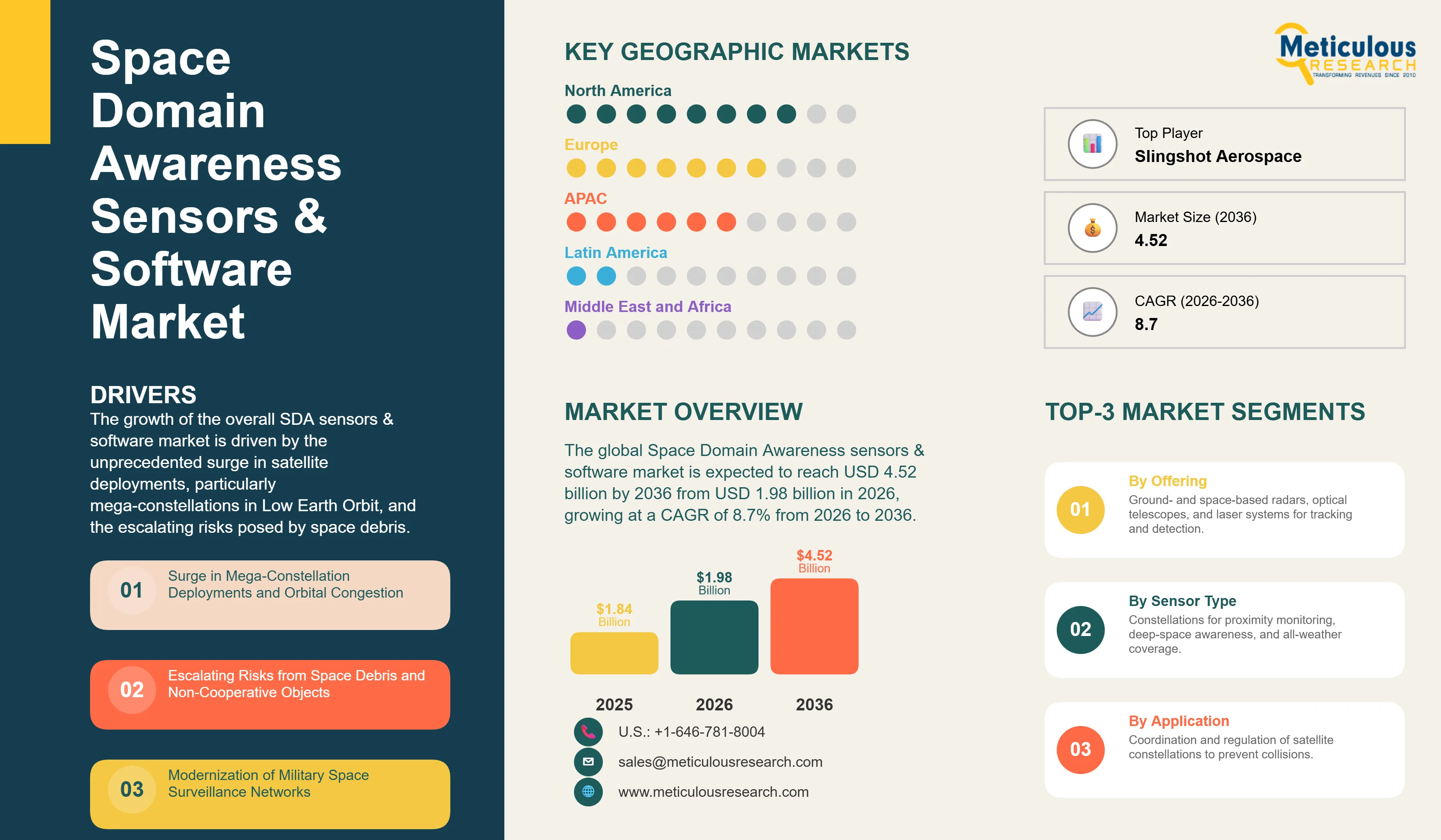 The global Space Domain Awareness (SDA) sensors & software market was valued at USD 1.84 billion in 2025. The market is expected to reach approximately USD 4.52 billion by 2036 from USD 1.98 billion in 2026, growing at a CAGR of 8.7% from 2026 to 2036. The growth of the overall SDA sensors & software market is driven by the unprecedented surge in satellite deployments, particularly mega-constellations in Low Earth Orbit (LEO), and the escalating risks posed by space debris. As space becomes increasingly congested and contested, the need for high-fidelity tracking, characterization, and predictive analytics has become essential for ensuring the safety and sustainability of orbital assets. The rapid expansion of commercial space traffic management (STM) services, coupled with the modernization of military space surveillance networks and the emergence of space-based sensing constellations, continues to fuel significant growth of this market across all major geographic regions.