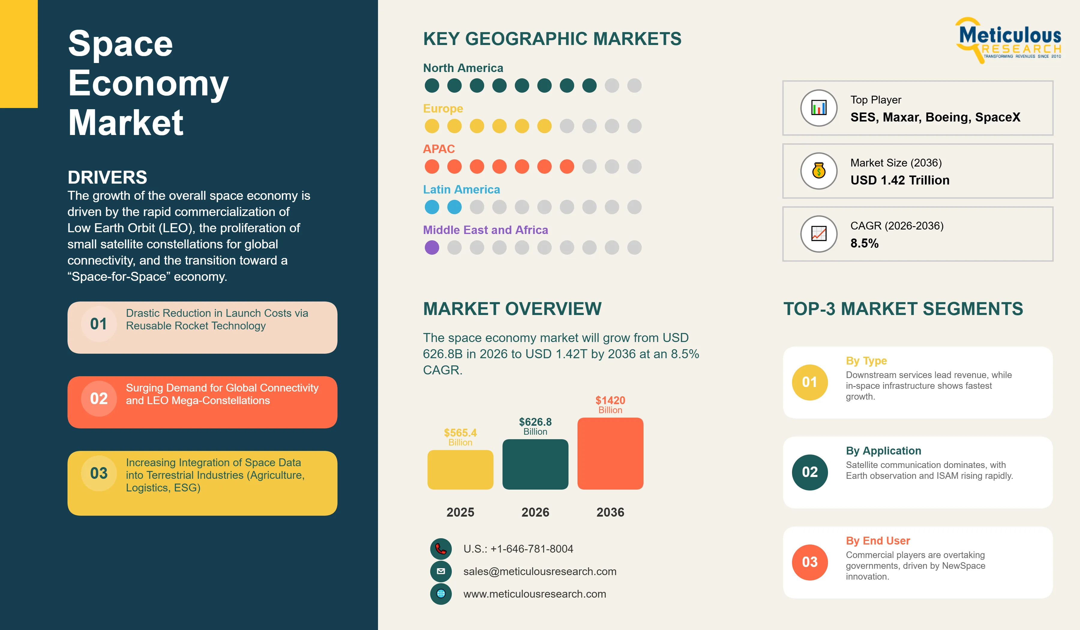 Report ID: MRICT - 1041708 Pages: 285 Feb-2026 Formats*: PDF Category: Information and Communications Technology Delivery: 24 to 72 Hours Download Free Sample ReportThe global space economy was valued at USD 565.4 billion in 2025. The market is expected to reach approximately USD 1.42 trillion by 2036 from USD 626.8 billion in 2026, growing at a CAGR of 8.5% from 2026 to 2036. The growth of the overall space economy is driven by the rapid commercialization of Low Earth Orbit (LEO), the proliferation of small satellite constellations for global connectivity, and the transition toward a “Space-for-Space” economy. As launch costs continue to decline due to reusable rocket technology, space has evolved from a government-led strategic domain into a vibrant commercial frontier. The integration of space-based data into terrestrial industries—such as agriculture, logistics, and climate monitoring—coupled with the emergence of in-space manufacturing and lunar exploration initiatives, continues to fuel significant growth of this market across all major geographic regions.