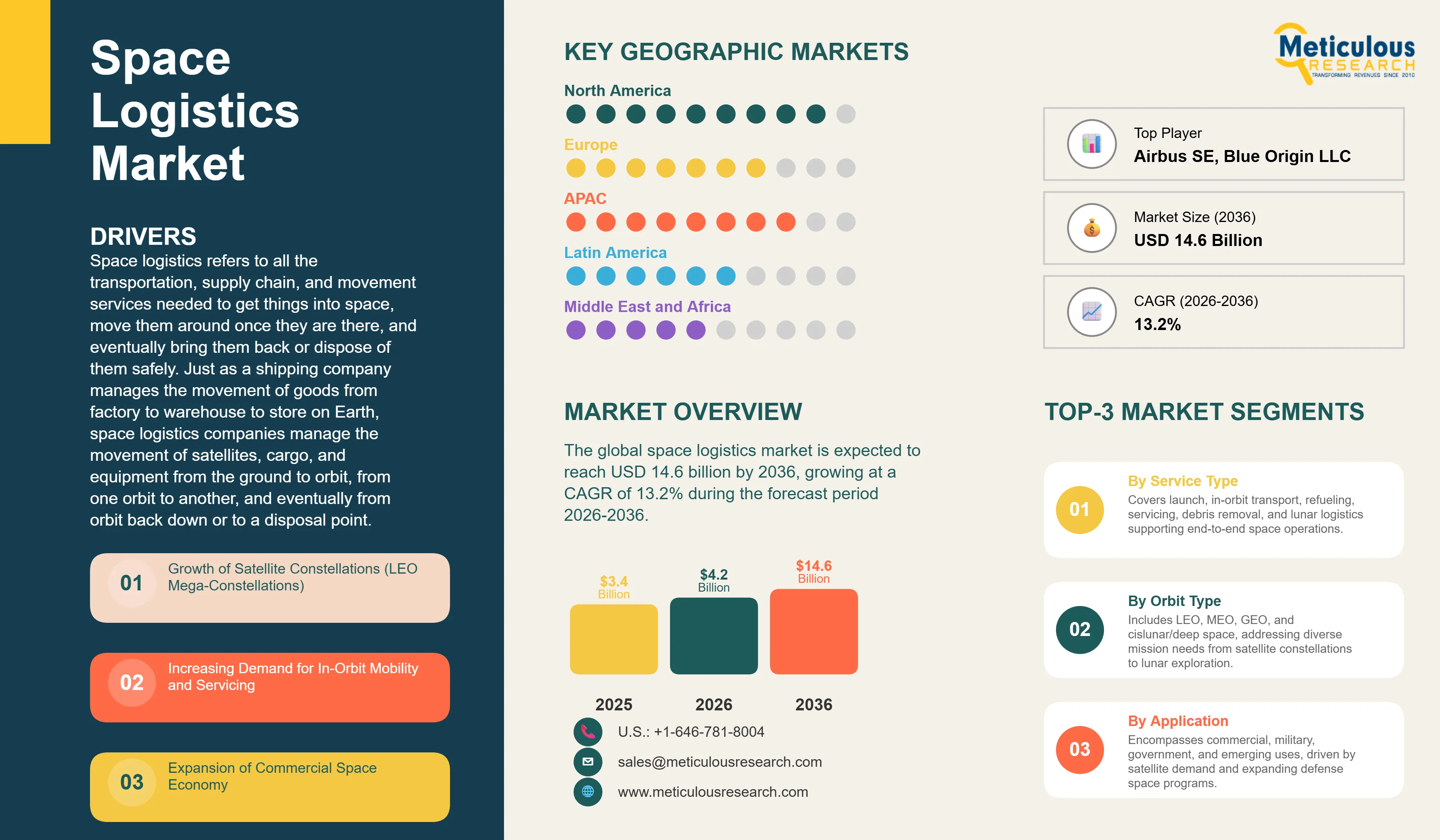 The market is primarily driven by the rapid expansion of LEO satellite mega-constellations creating very large launch logistics and in-orbit transportation demand, and by the development of NASA's Artemis lunar program and the associated commercial lunar services market opening a new and growing logistics frontier beyond low earth orbit that will require dedicated commercial logistics services.