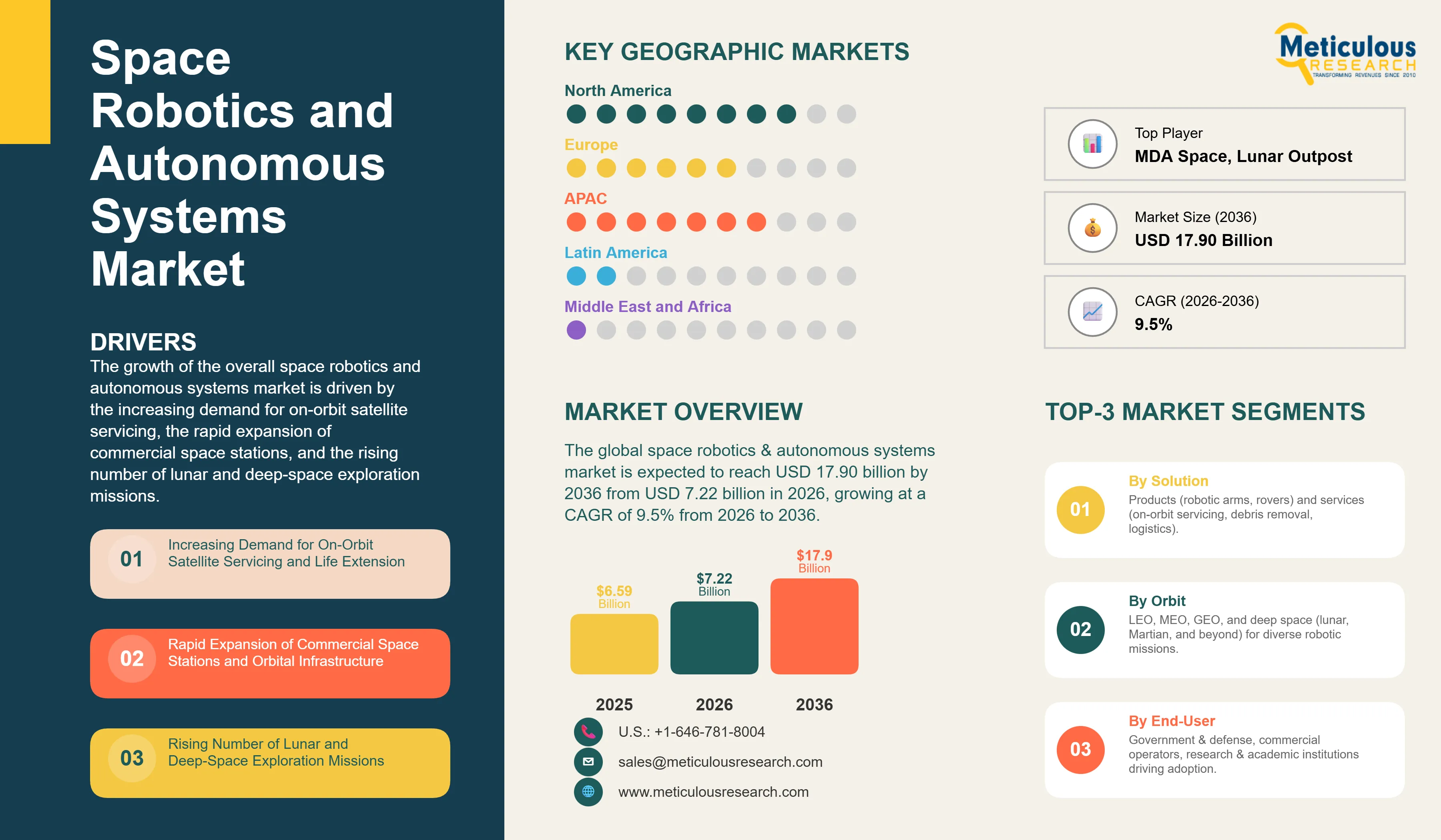 The global space robotics and autonomous systems market is projected to reach a valuation of USD 17.90 billion by 2036, expanding from USD 7.22 billion in 2026. This significant growth trajectory is underpinned by a robust Compound Annual Growth Rate (CAGR) of 9.5% over the forecast period, reflecting the technology’s transition from experimental missions to mainstream orbital and lunar logistics.