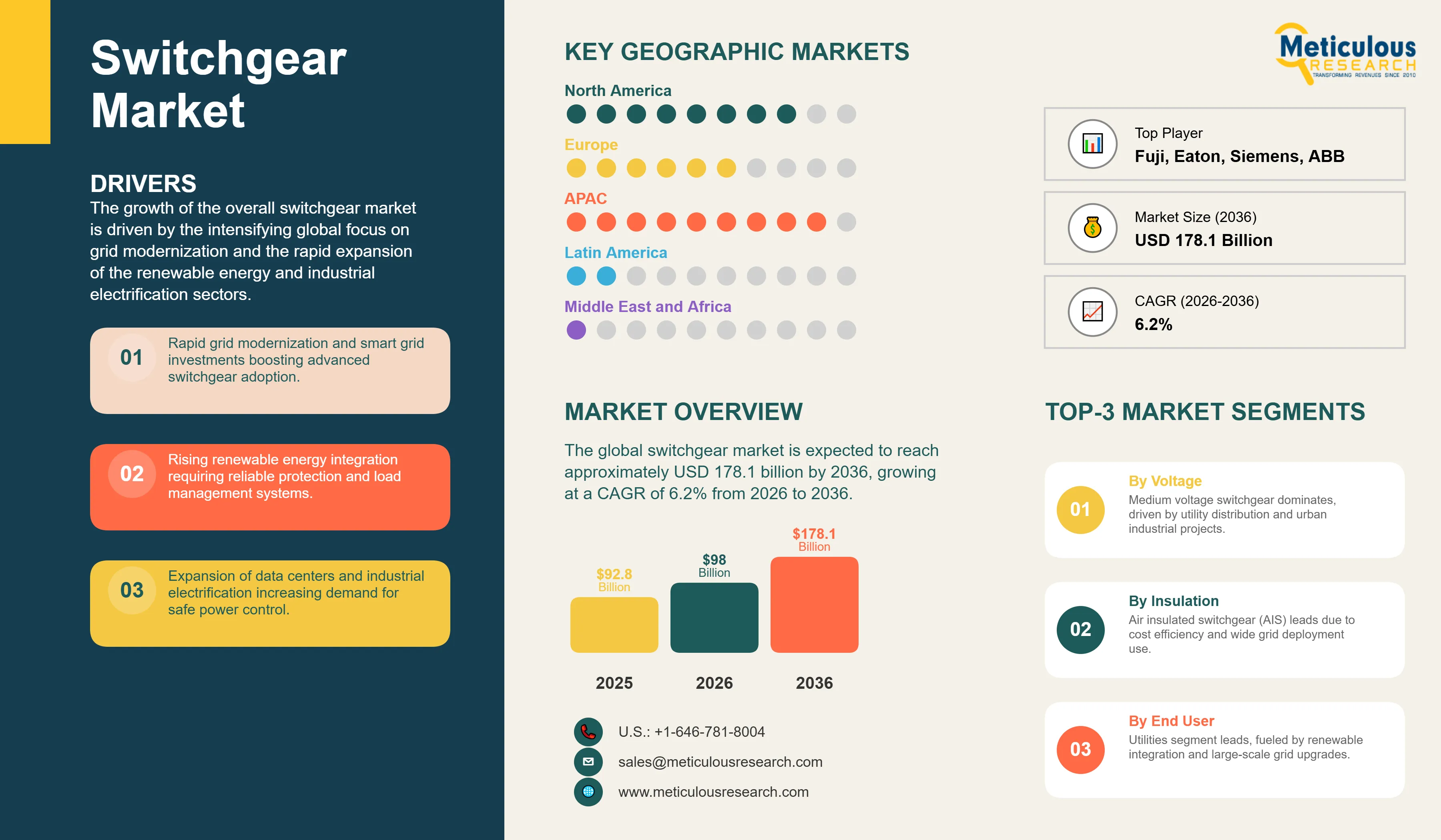 Report ID: MREP - 1041745 Pages: 268 Feb-2026 Formats*: PDF Category: Energy and Power Delivery: 24 to 72 Hours Download Free Sample ReportThe global switchgear market was valued at USD 92.8 billion in 2025. The market is expected to reach approximately USD 178.1 billion by 2036 from USD 98.0 billion in 2026, growing at a CAGR of 6.2% from 2026 to 2036. The growth of the overall switchgear market is driven by the intensifying global focus on grid modernization and the rapid expansion of the renewable energy and industrial electrification sectors. As utility providers seek to integrate more functionality into power distribution and energy management systems, switchgear infrastructure has become essential for maintaining high-performance electrical safety and operational reliability. The rapid expansion of smart grid initiatives and the increasing need for high-reliability protection in data centers and industrial complexes continue to fuel significant growth of this market across all major geographic regions.