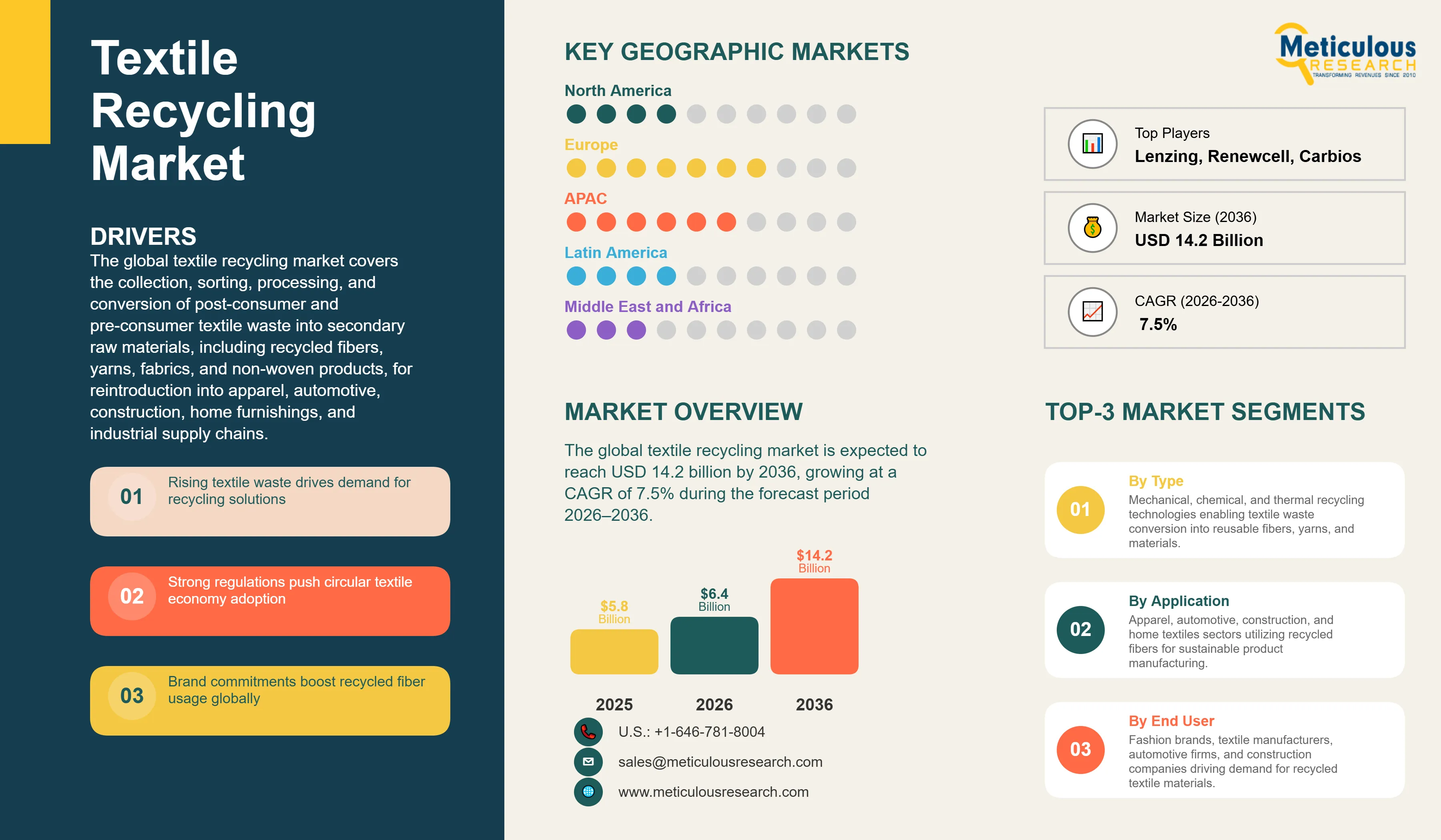 The growth of this market is primarily driven by rising global textile waste volumes and increasing landfill pressure, the accelerating adoption of binding EPR legislation and circular economy regulations mandating separate textile waste collection and brand financial responsibility for end-of-life management, growing consumer and brand demand for verified recycled fiber content, and the commercial scale-up of chemical recycling technologies enabling near-virgin quality fiber-to-fiber recycling from post-consumer waste feedstocks.