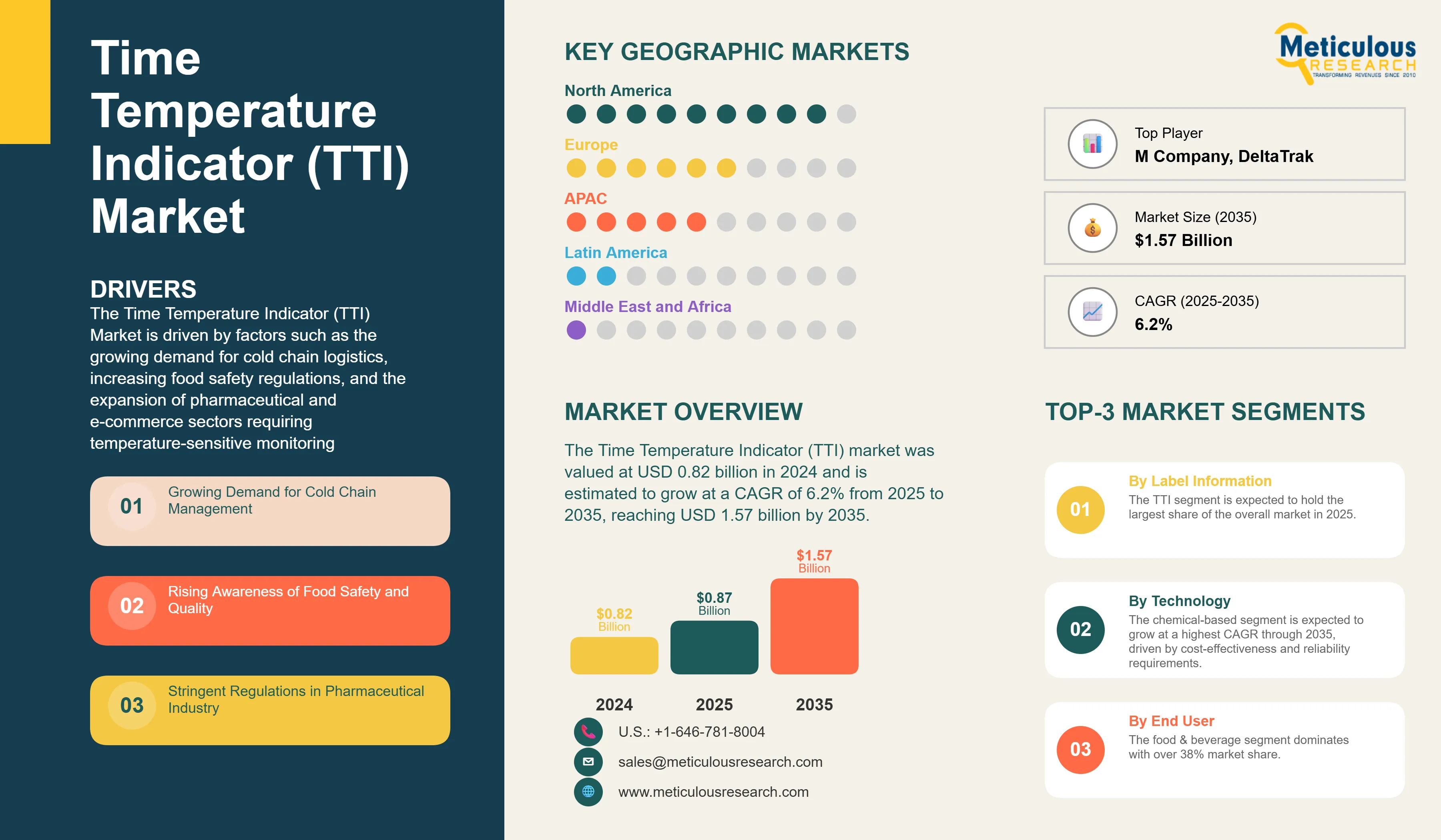 The Time Temperature Indicator Market size is expected to reach USD 867 million in 2025 and grow at a CAGR of 6.2% to reach USD 1.57 billion by 2035.