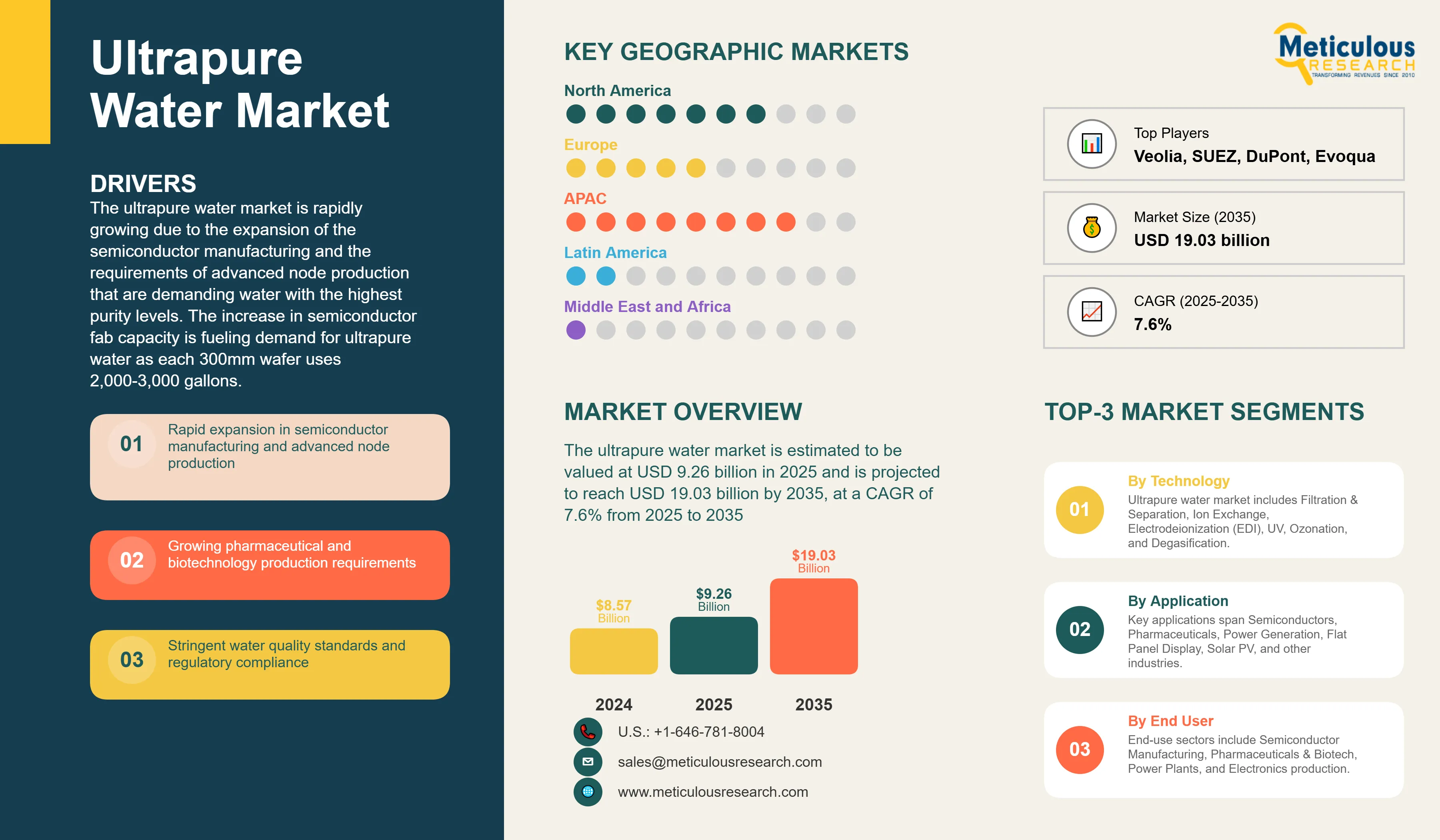 The ultrapure water market is expanding due to semiconductor industry growth, pharmaceutical production requirements, power generation efficiency needs, and stringent regulatory standards. Additionally, technological advancements, water recycling initiatives, and smart monitoring systems improve their competitiveness in this industry.