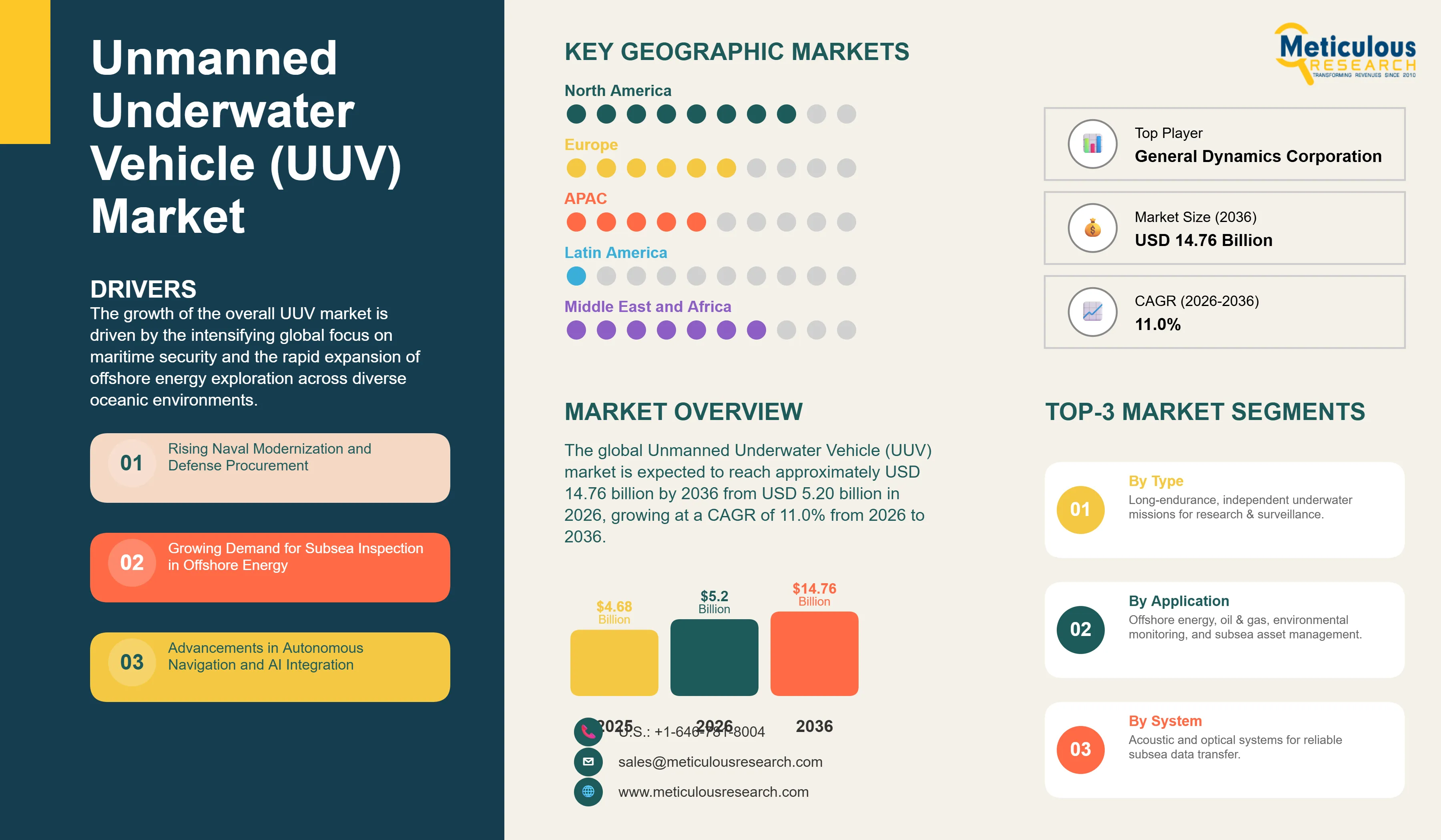 Report ID: MRSE - 1041760 Pages: 268 Feb-2026 Formats*: PDF Category: Semiconductor and Electronics Delivery: 24 to 72 Hours Download Free Sample ReportThe global Unmanned Underwater Vehicle (UUV) market was valued at USD 4.68 billion in 2025. The market is expected to reach approximately USD 14.76 billion by 2036 from USD 5.20 billion in 2026, growing at a CAGR of 11.0% from 2026 to 2036. The growth of the overall UUV market is driven by the intensifying global focus on maritime security and the rapid expansion of offshore energy exploration across diverse oceanic environments. As naval forces seek to integrate more intelligence into their undersea frameworks and address the increasing demand for real-time subsea monitoring and asset protection, advanced UUV platforms have become essential for maintaining operational integrity and strategic performance. The rapid expansion of autonomous underwater mapping and the increasing need for high-performance subsea inspection and intervention continue to fuel significant growth of this market across all major geographic regions.