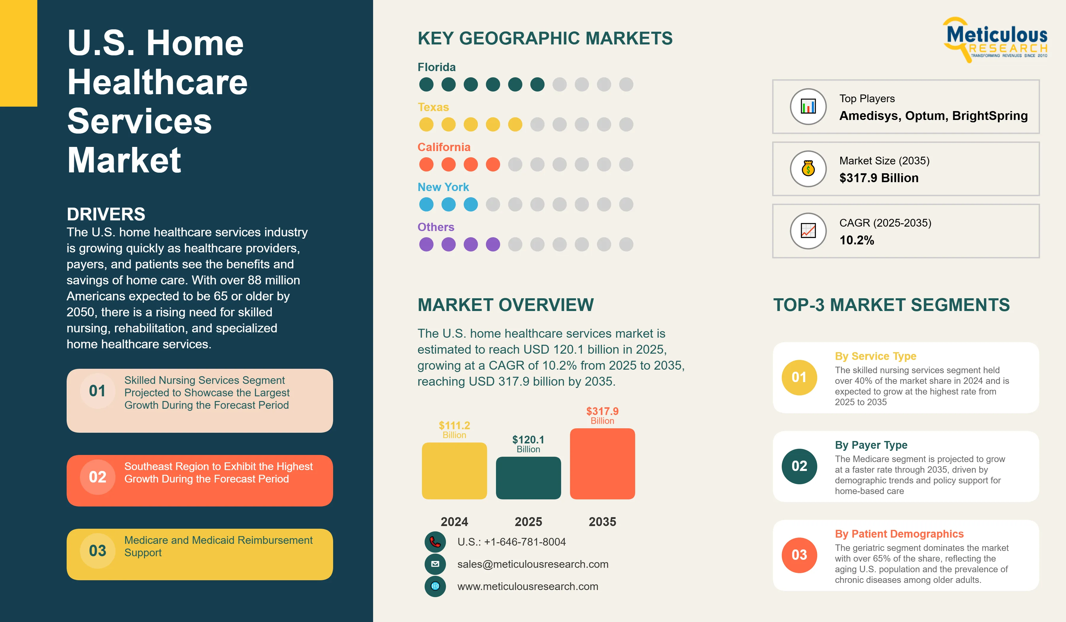 Florida is at the forefront with around 4.6 million residents aged 65 and older, making up about 21% of the state's population in 2025. The state's home healthcare market mainly benefits from the growth of Medicare Advantage plans and state Medicaid waiver programs that focus on home and community-based services. Texas is also making strides, with important investments in rural home healthcare access and telehealth infrastructure.