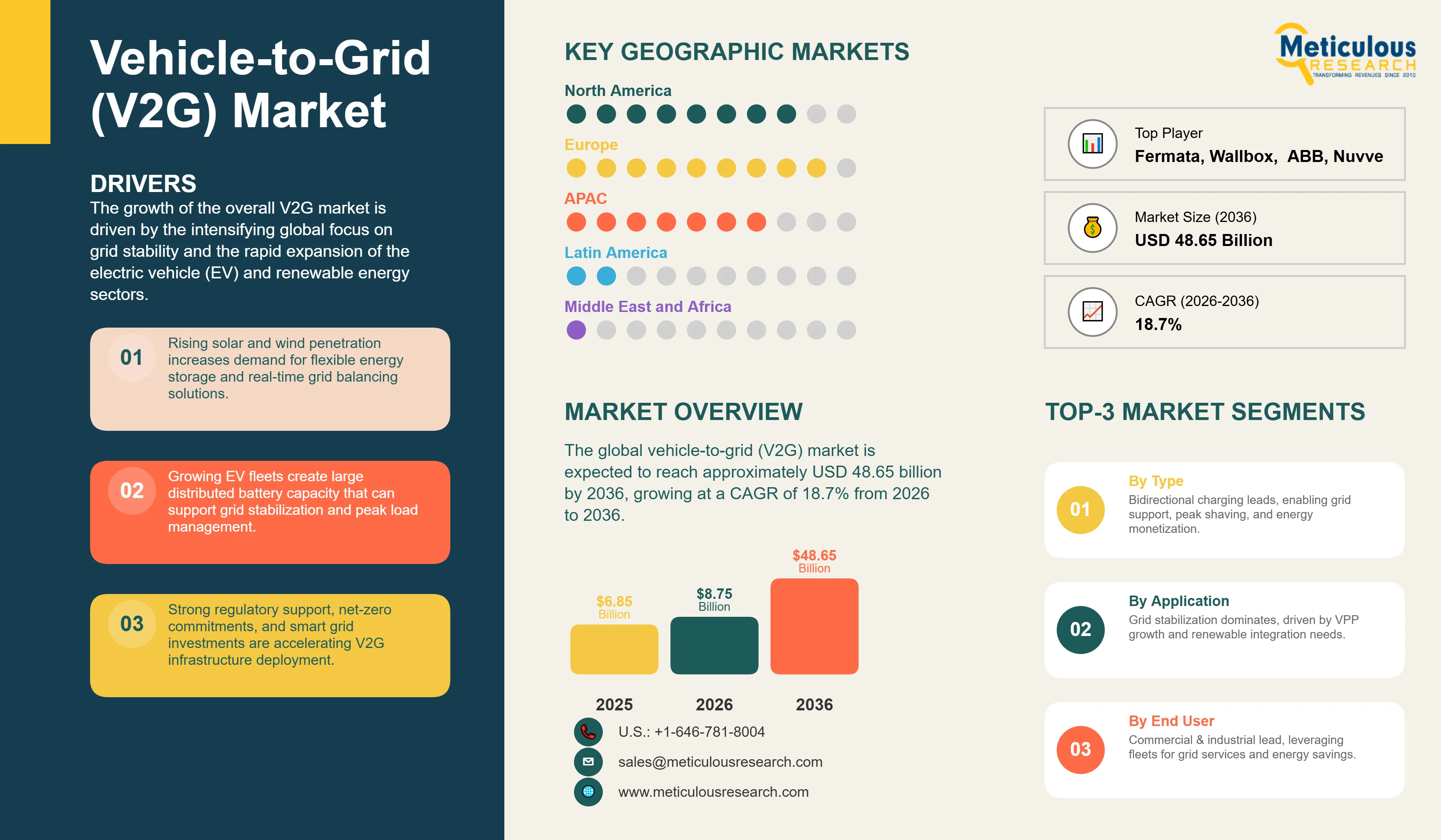 Report ID: MRAUTO - 1041733 Pages: 262 Feb-2026 Formats*: PDF Category: Automotive and Transportation Delivery: 24 to 72 Hours Download Free Sample ReportThe global vehicle-to-grid (V2G) market was valued at USD 6.85 billion in 2025. The market is expected to reach approximately USD 48.65 billion by 2036 from USD 8.75 billion in 2026, growing at a CAGR of 18.7% from 2026 to 2036. The growth of the overall V2G market is driven by the intensifying global focus on grid stability and the rapid expansion of the electric vehicle (EV) and renewable energy sectors. As manufacturers seek to integrate more flexibility into power distribution networks and address the increasing demand for decentralized energy storage, advanced V2G systems have become essential for maintaining grid reliability and mechanical durability. The rapid expansion of the smart grid infrastructure and the increasing need for high-performance bidirectional charging solutions continue to fuel significant growth of this market across all major geographic regions.