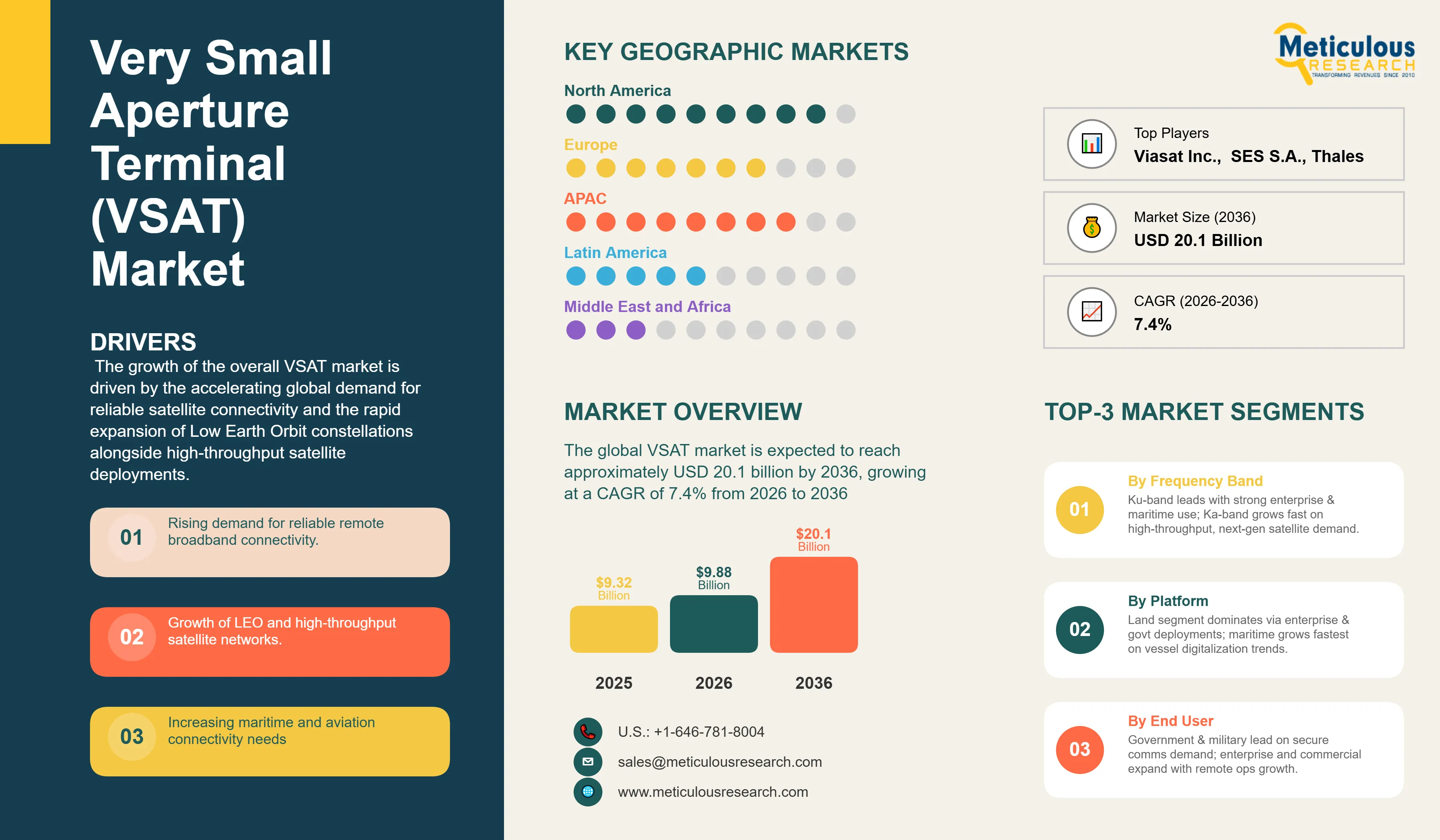 Report ID: MRAD - 1041785 Pages: 293 Feb-2026 Formats*: PDF Category: Aerospace and Defense Delivery: 24 to 72 Hours Download Free Sample ReportThe global VSAT market was valued at USD 9.32 billion in 2025. The market is expected to reach approximately USD 20.1 billion by 2036 from USD 9.88 billion in 2026, growing at a CAGR of 7.4% from 2026 to 2036. The growth of the overall VSAT market is driven by the accelerating global demand for reliable satellite connectivity and the rapid expansion of Low Earth Orbit constellations alongside high-throughput satellite deployments. As enterprises and government agencies seek to integrate advanced communication systems into remote operations and mobility platforms, VSAT infrastructure has become essential for maintaining high-performance connectivity and operational continuity. The rapid proliferation of digital transformation initiatives and the increasing need for secure, low-latency connectivity in maritime, aviation, and energy sectors continue to fuel significant growth of this market across all major geographic regions.