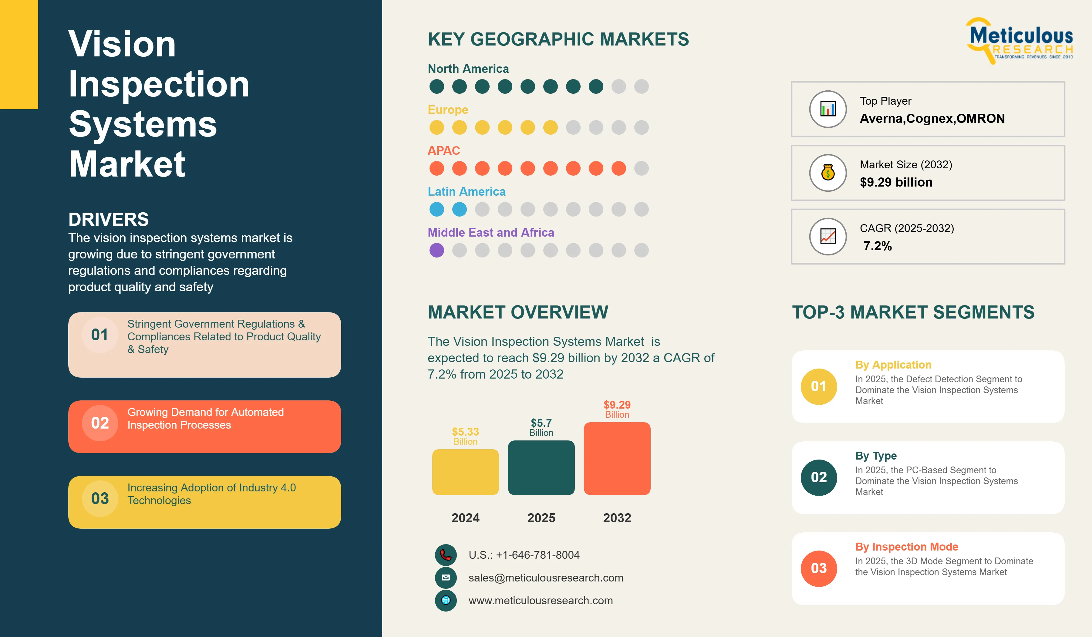 The Vision Inspection Systems Market is expected to reach $9.29 billion by 2032, at a CAGR of 7.2% from 2025 to 2032.