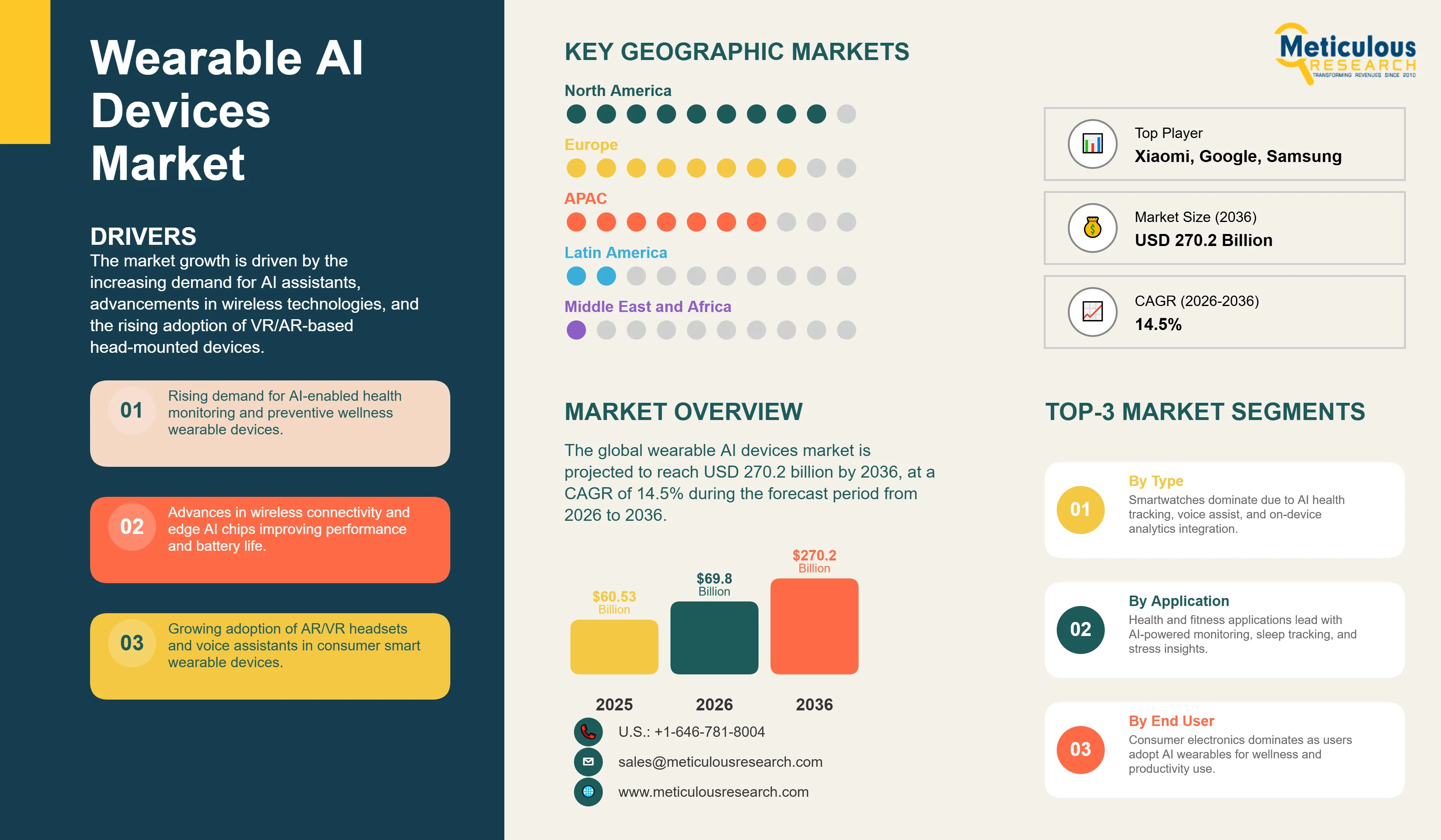Report ID: MRSE - 104280 Pages: 227 Feb-2026 Formats*: PDF Category: Semiconductor and Electronics Delivery: 24 to 48 Hours Download Free Sample ReportThe global wearable AI devices market is valued at USD 60.53 billion in 2025. This market is projected to reach USD 270.2 billion by 2036 from USD 69.8 billion in 2026, at a CAGR of 14.5% during the forecast period from 2026 to 2036. The market growth is driven by the increasing demand for AI assistants, advancements in wireless technologies, and the rising adoption of VR/AR-based head-mounted devices.